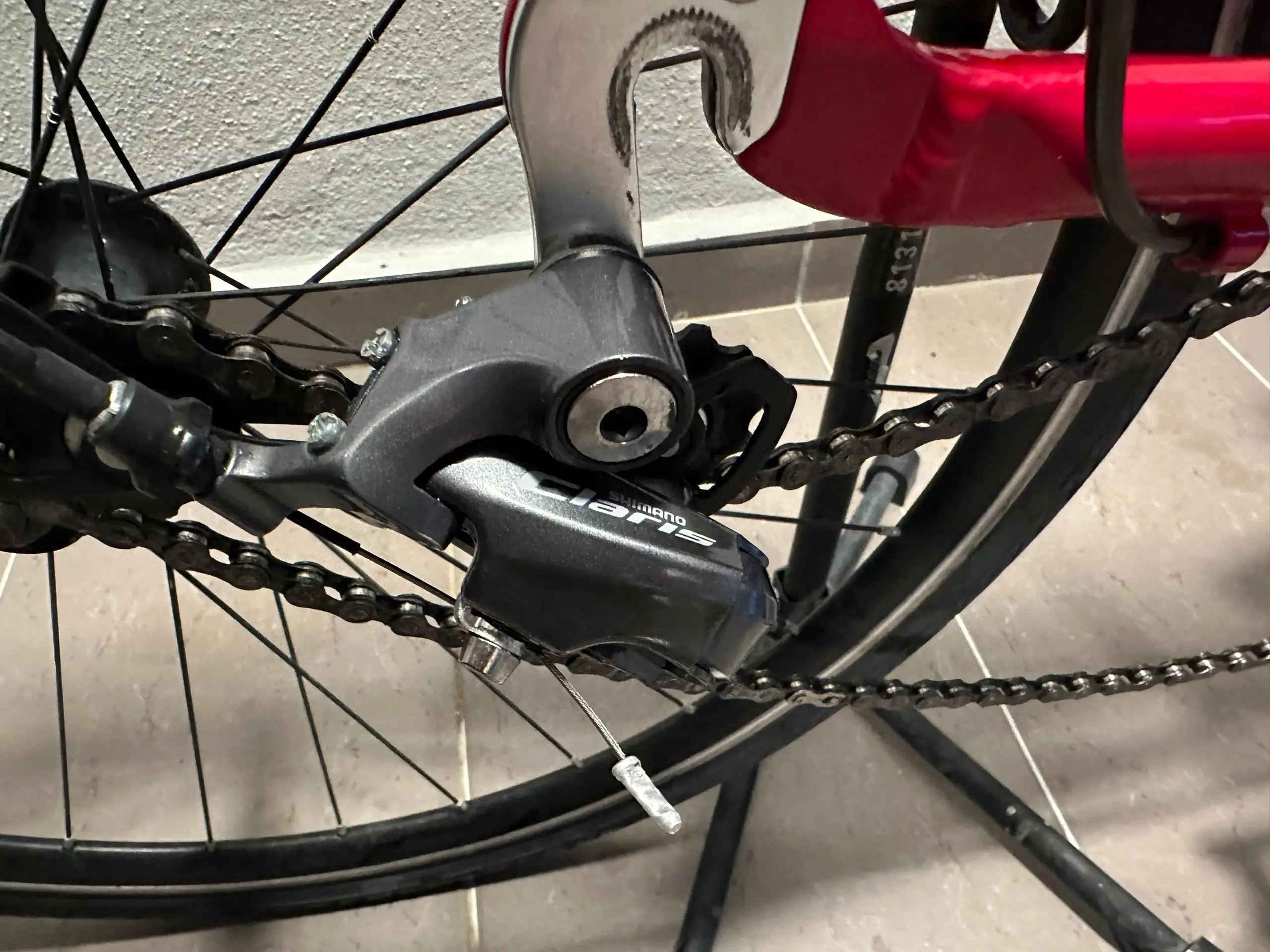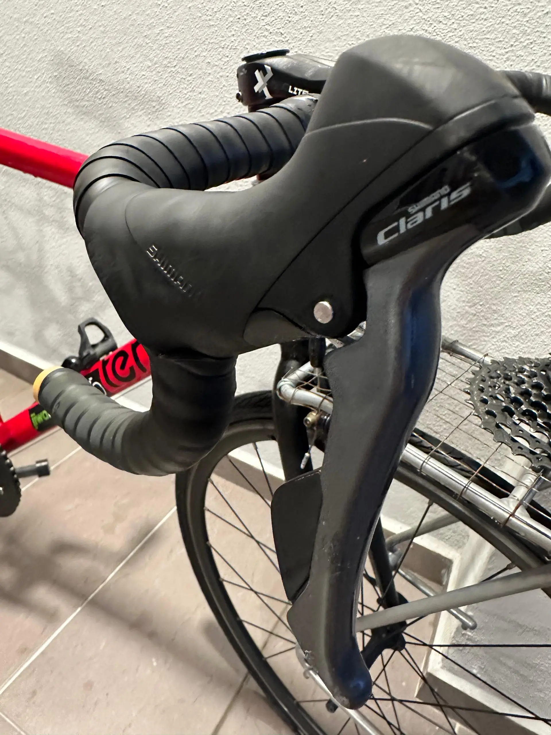 b) Groupset Shimano Claris, single chairing, 9 speed and brake caliper.