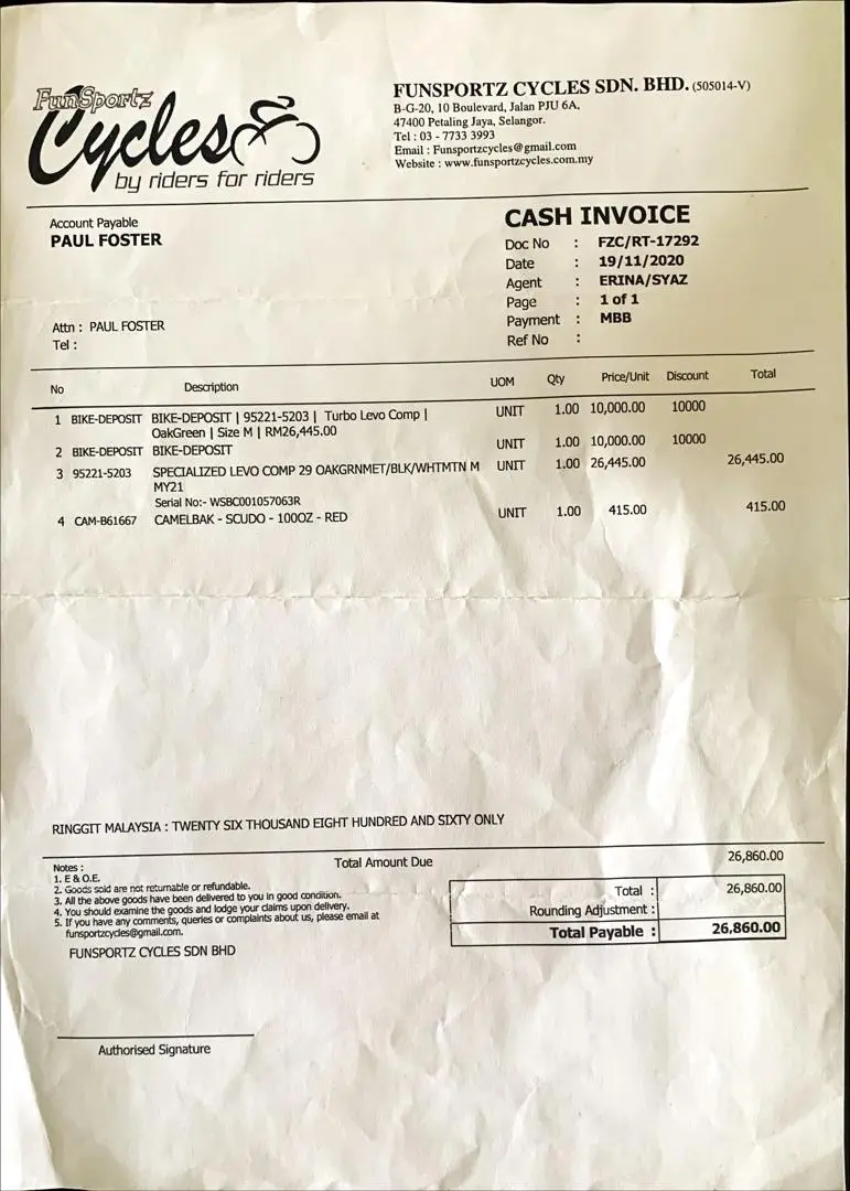 Original purchase receipt, one owner