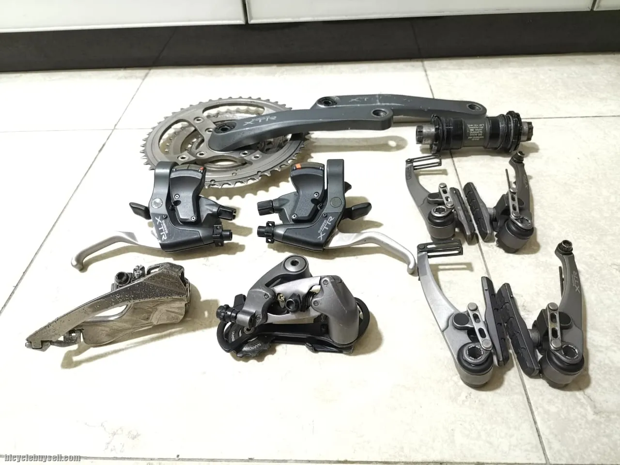 Used. Collector item, rare legendary Shimano XTR M950 Group set. FC-M950 Crankset, 22,32,44, 170 mm. BB-M950, bottom bracket. SL-M950, Integrated Brake lever + Rapid fire shifter - 3 x 8 FD-M950, Front Derailleur down clamp, down pull 31.8mm RD-M950, Rear Derailleur 8s BR-M950, V-brake calipers ( 2 pairs ) Asking RM 3200 Serious buyer WhatsApp 0124775123 for details. COD Penang. Postage at buyer cost.