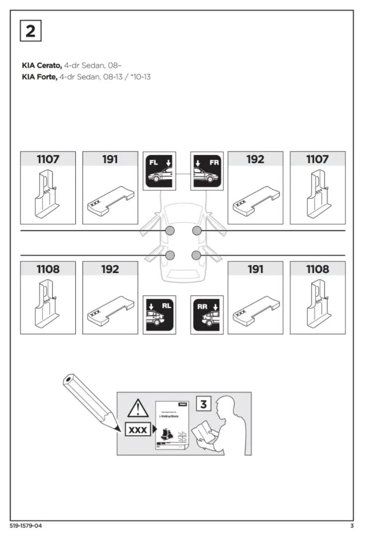 - KIA: Forte 4-dr Sedan with Normal Roof 2008 - 2013 Cerato 4-dr Sedan (Mk. II) with Normal Roof 2009 - 2012 Included postage Model: 1579 2x 191 2x 192 2x 1107 2x 1108 Used but in very good condition. <1 year. Brand new RM330 Included postage Guarantee can used.if you have Thule wingbar, aerobar, can help to install at my area. Reason for sales, Sold my car