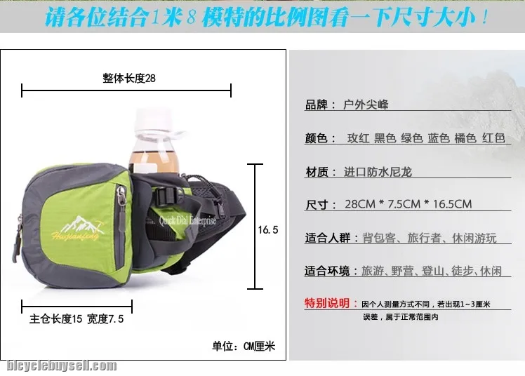Sport Waist Bag With Bottle Holder Item Code : WB-10 Quick Detail : Gender : Unisex Color : Black / Green / Red / Blue /Orange Size : 28.cm * 7.5cm* 16.5cm Usage : Sports,Running Logo : Silk-printing;Heat-transfer;Embroidery Specifications 1.Sport waist bag with bottle holder 2.One side cell phone pocket Please feel free contact me : 0164584527 ( or Whatsapp ) Our email add : quickdialcycling@gmail.com We welcome Wholesale Dealer /Group Order and please visit our Facebook and LIKE Page : http://www.facebook.com/pages/Quick-Dial-Enterprise/563564006993155?ref=hl http://www.lelong.com.my/Auc/Feedback/UserRating.asp?UserID=quickdial@1 Address : 5-05-07 Hunza Complex, Jalan Gangsa , 11600 Penang. Please feel free make appoinment for viewing. Contact Number : 0164584527 (whatsapp)