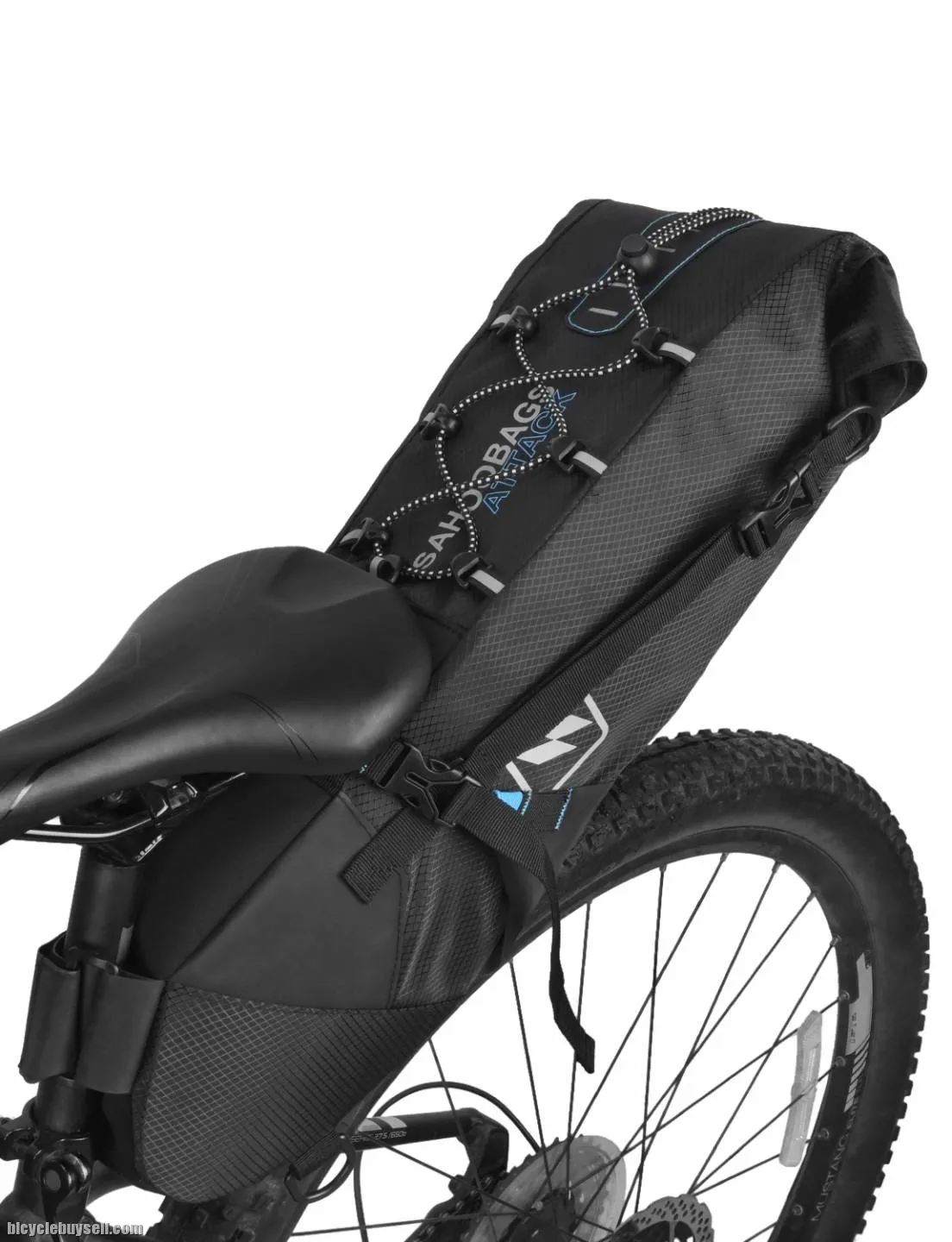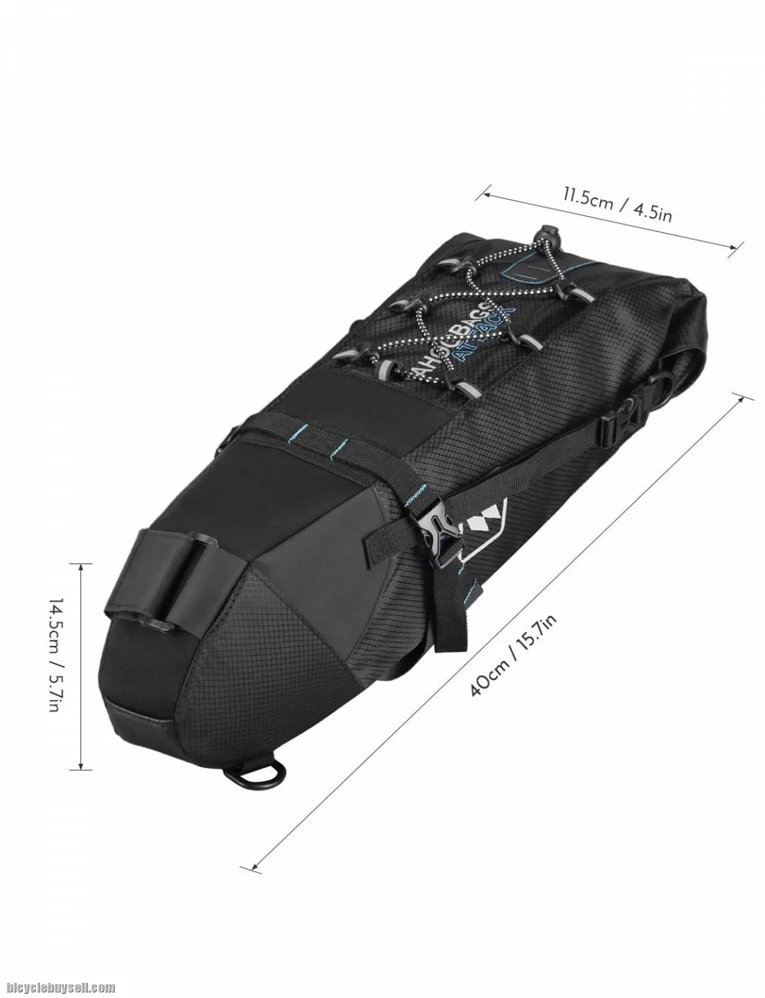 Adjustable strap with quick-release buckle to keep the bag firmly fastened to the saddle.