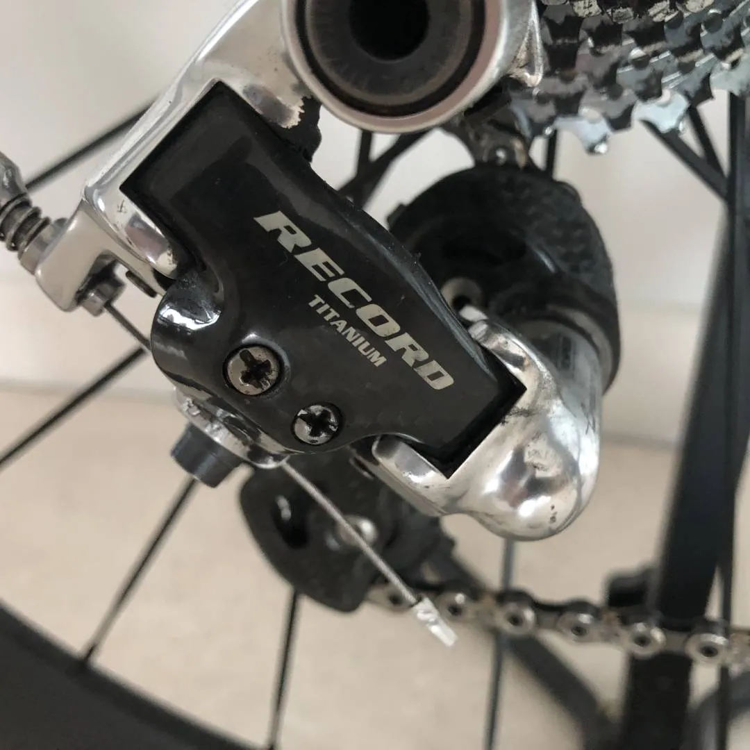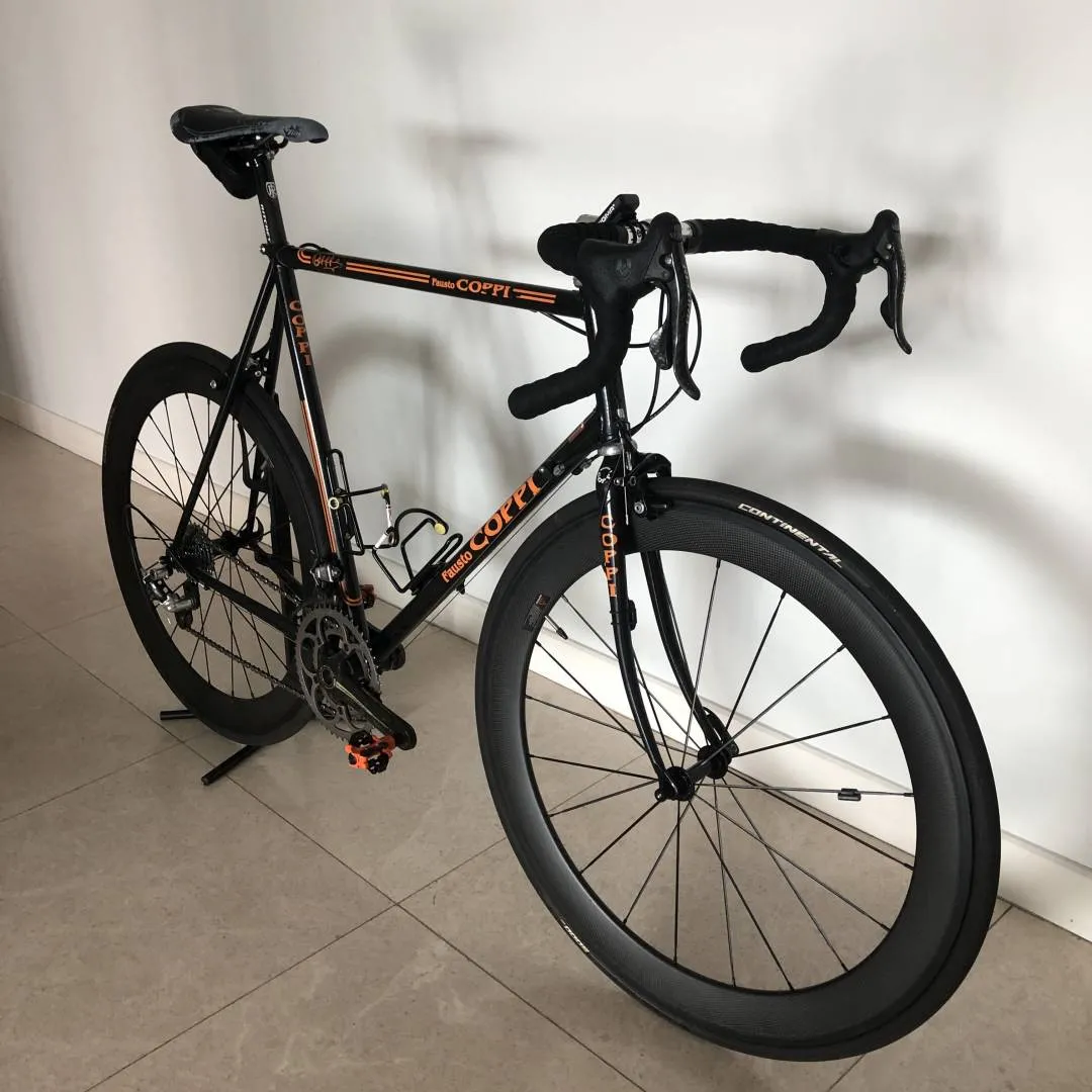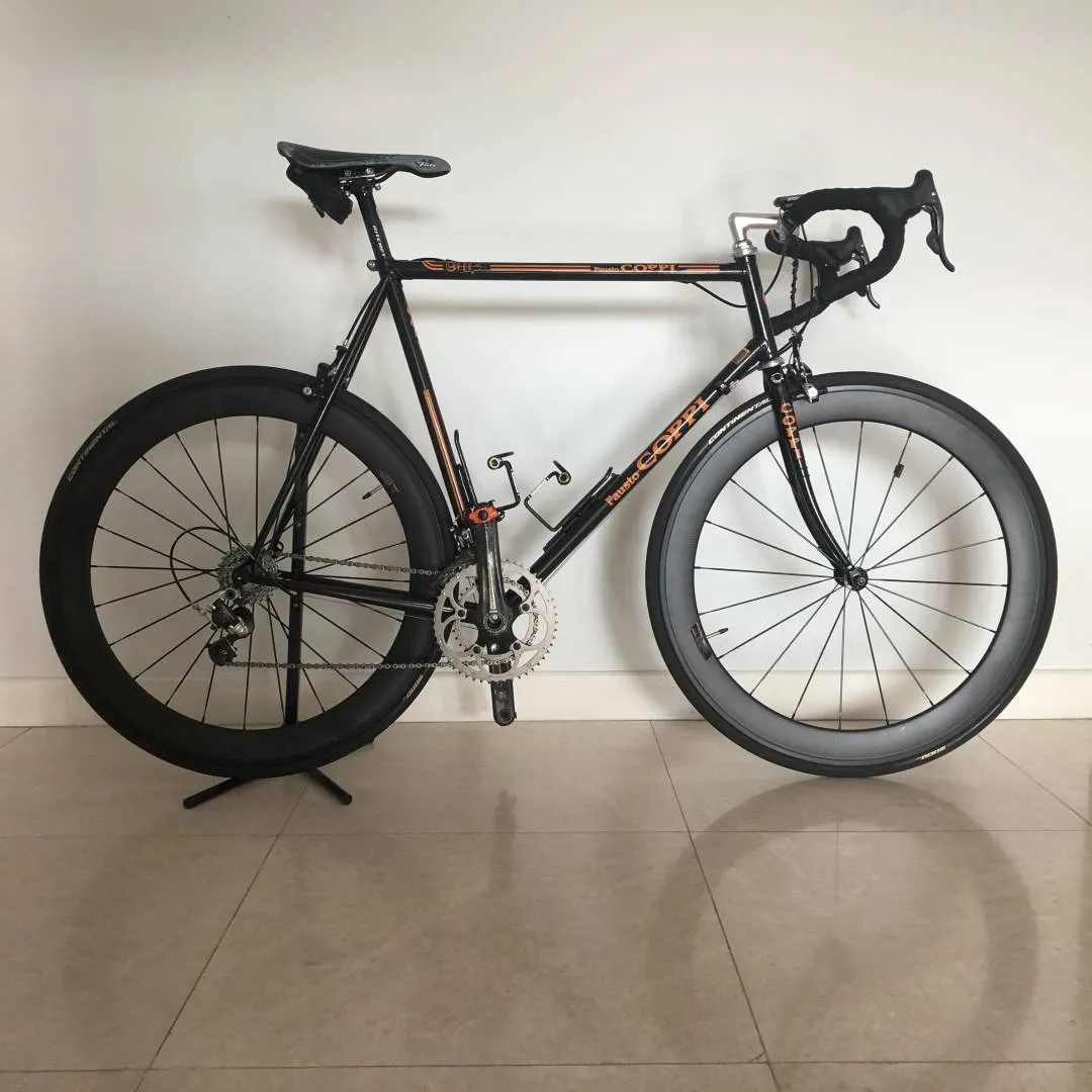 Fausto Coppi frame made during the Masciaghi era (late 1990s). The frame is made from Columbus Thron OS by Luigi Pelizzoli during the time the Fausto Coppi brand name was owned by Masciaghi, Milano. I bought the frame during the pandemic NOS and built it up as neo-classic racer during that time. Thus, the bike is in perfect condition. Chain, cassette, chainrings, cables, brake pads have seen <1000km of action. No dents, not dings, no scratches, only the decals are beginning to deteriorate. The powder coating is flawless. Traditional lugged frame with a height of 60cm c-t and a top tube length of 58cm, semi vertical drop outs, 27.2 seat post, 1' threaded fork. Built up with a full 2008 Campagnolo Record 10 speed group set, i.e. Ergopower, brake callipers, rear and front derailleur, compact crankset 50-34, and chain. The bottom bracket cups are Super Record, the cassette is Veloce 11-26. Headset also Campagnolo Record 1' threaded. The brake and shifting cables are Campagnolo Ultra Shift. The wheel set is full carbon clincher with 60mm rims with Continentale Gatorskin. Stem: Cinelli A1 90mm. Seat post: Ritchey Carbon. Pedals Ritchey XC comp V5.