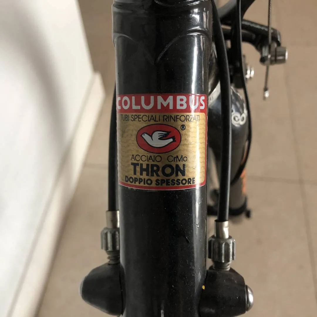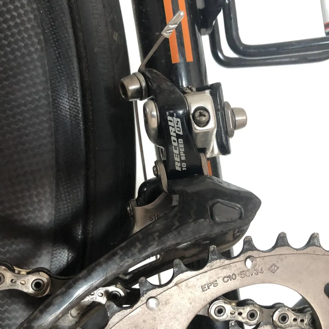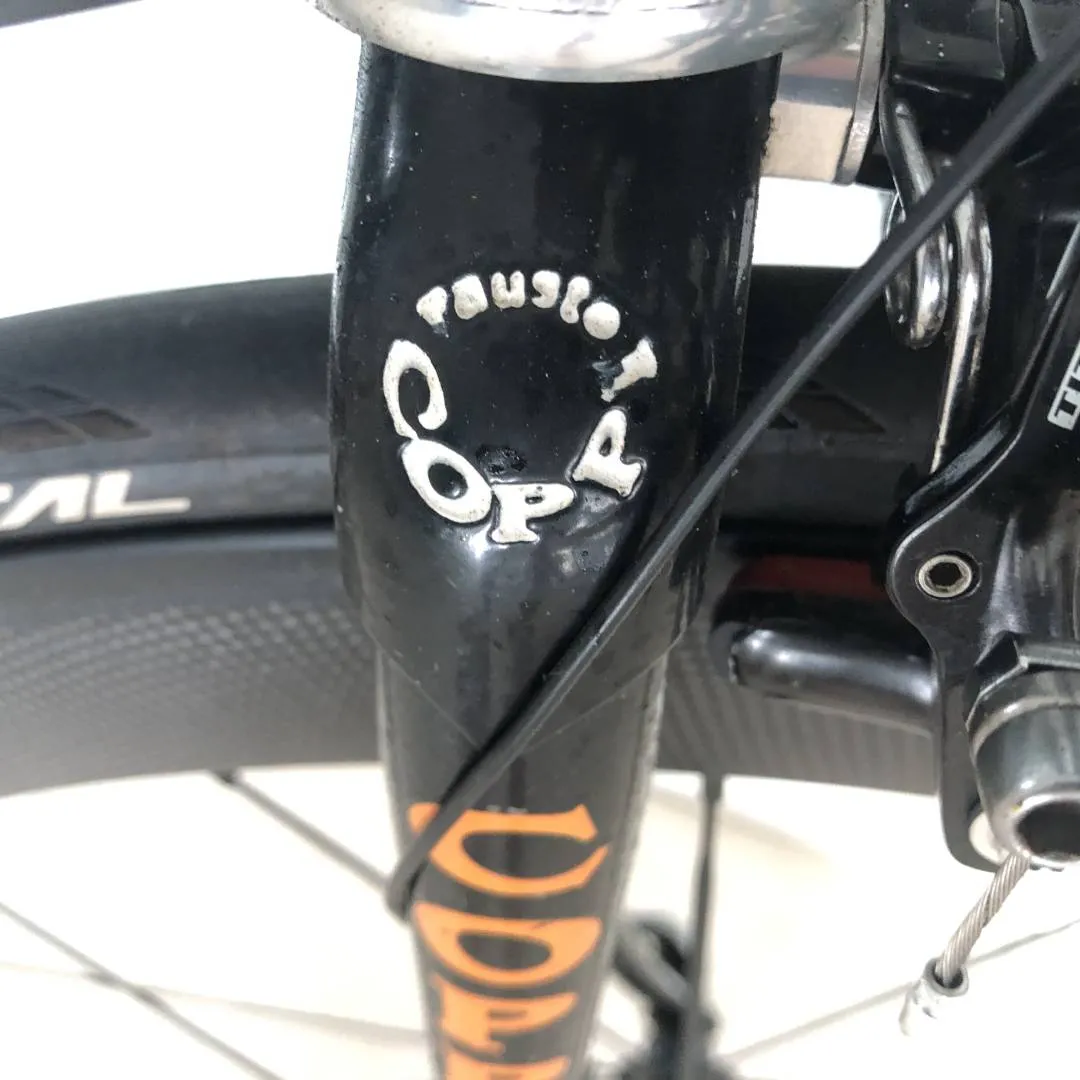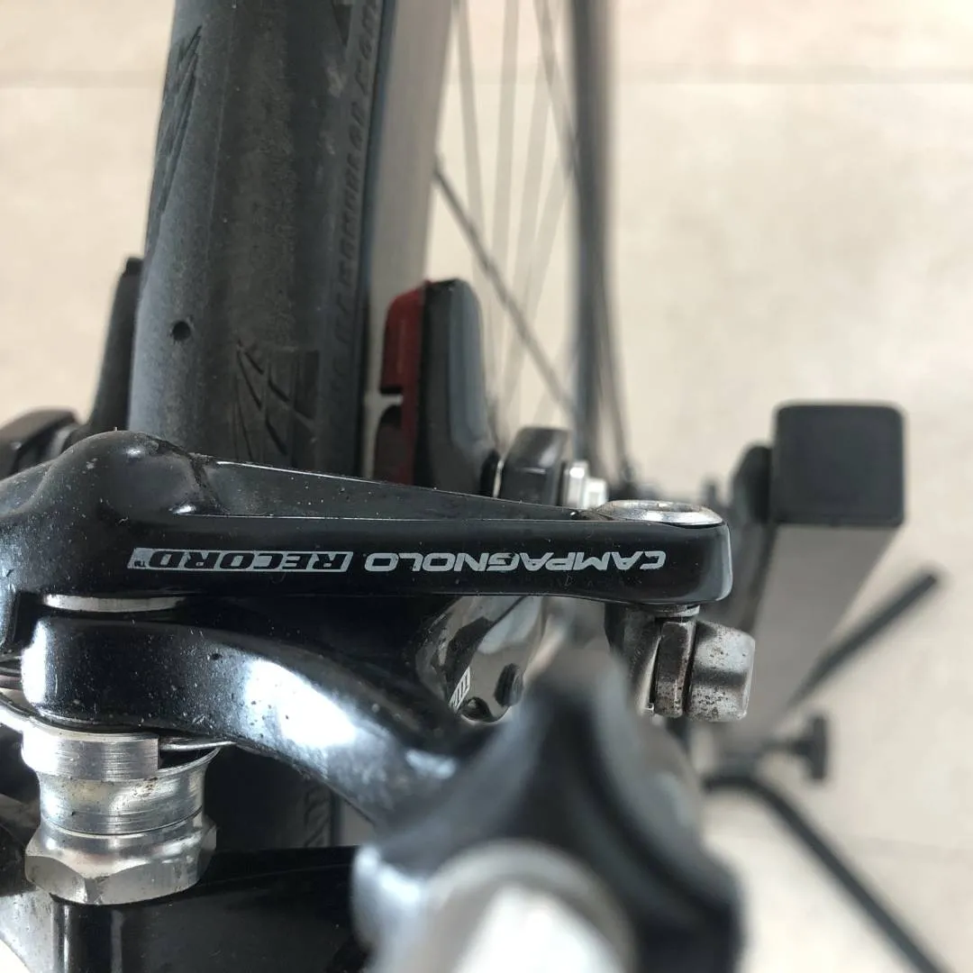 Fausto Coppi frame made during the Masciaghi era (late 1990s). The frame is made from Columbus Thron OS by Luigi Pelizzoli during the time the Fausto Coppi brand name was owned by Masciaghi, Milano. I bought the frame during the pandemic NOS and built it up as neo-classic racer during that time. Thus, the bike is in perfect condition. Chain, cassette, chainrings, cables, brake pads have seen <1000km of action. No dents, not dings, no scratches, only the decals are beginning to deteriorate. The powder coating is flawless. Traditional lugged frame with a height of 60cm c-t and a top tube length of 58cm, semi vertical drop outs, 27.2 seat post, 1' threaded fork. Built up with a full 2008 Campagnolo Record 10 speed group set, i.e. Ergopower, brake callipers, rear and front derailleur, compact crankset 50-34, and chain. The bottom bracket cups are Super Record, the cassette is Veloce 11-26. Headset also Campagnolo Record 1' threaded. The brake and shifting cables are Campagnolo Ultra Shift. The wheel set is full carbon clincher with 60mm rims with Continentale Gatorskin. Stem: Cinelli A1 90mm. Seat post: Ritchey Carbon. Pedals Ritchey XC comp V5.