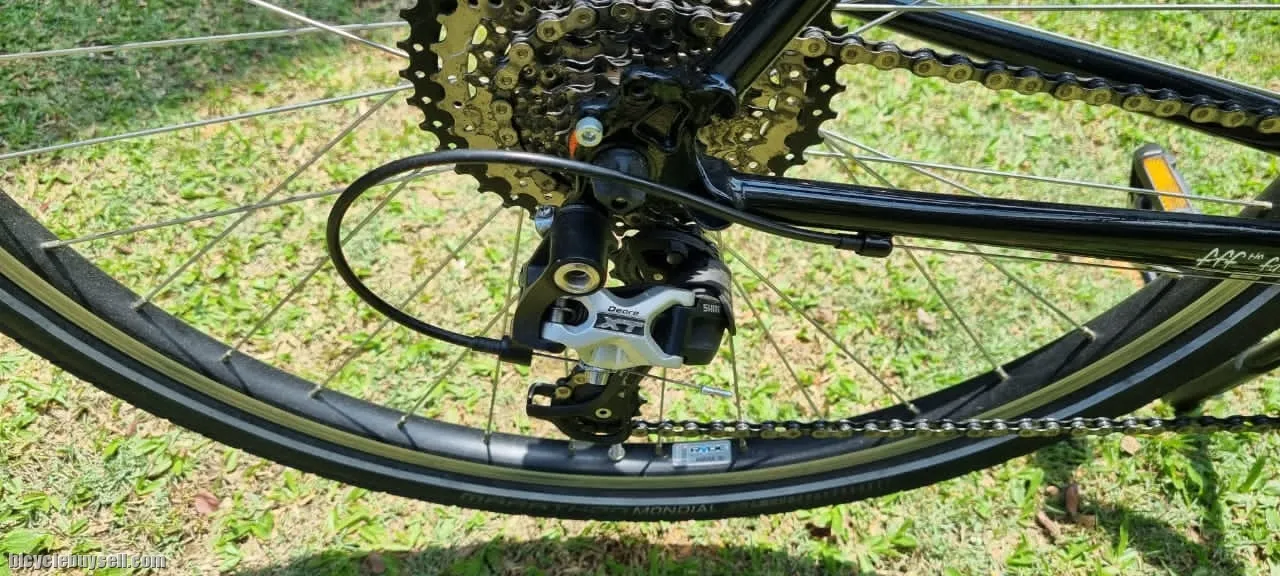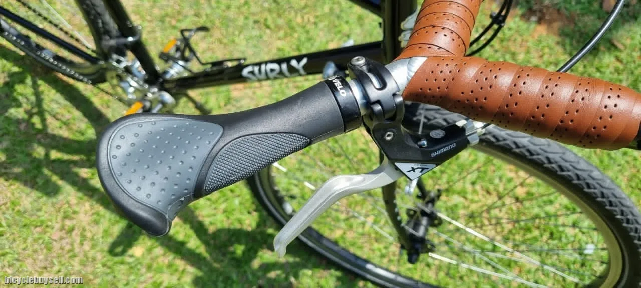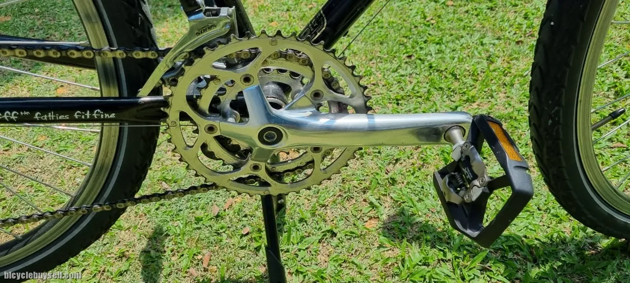 Original Sugino triple chainring, Shimano XT components : cassete, brake lever, rim, hub & dual purpose pedals. Brooks: saddle & bar tapes. Velo Orange Crazybar wt original bar-end shifters custom fitted on d horns.(super comfortable). Velo grips. Ergotec Octopus, adjustable stem. Ritchey seatpost. Schwalbe Mondial 700c × 40 tyres. Litepro stand. Not in d picture, original drop bar, brake levers & matching SKS mudguard.
