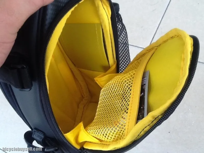 Large capacity saddle pack with bottle carrier.