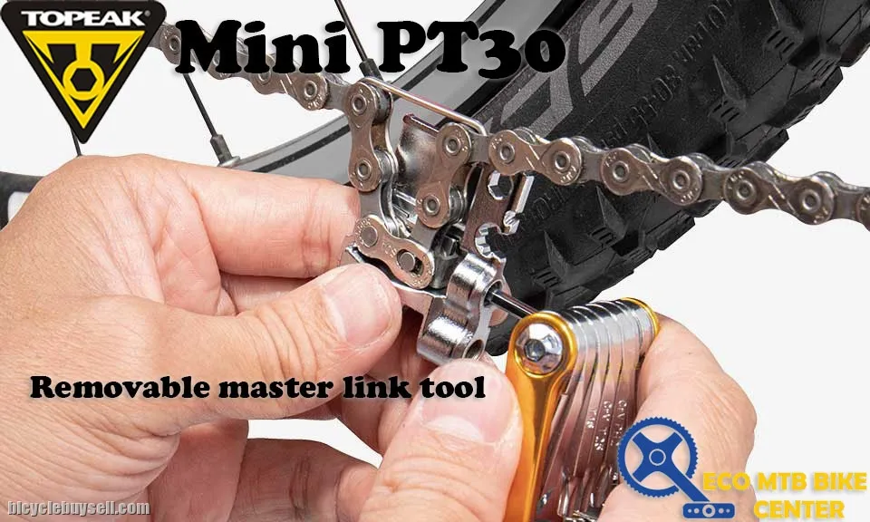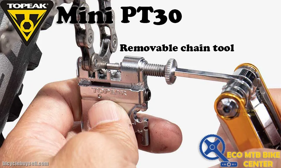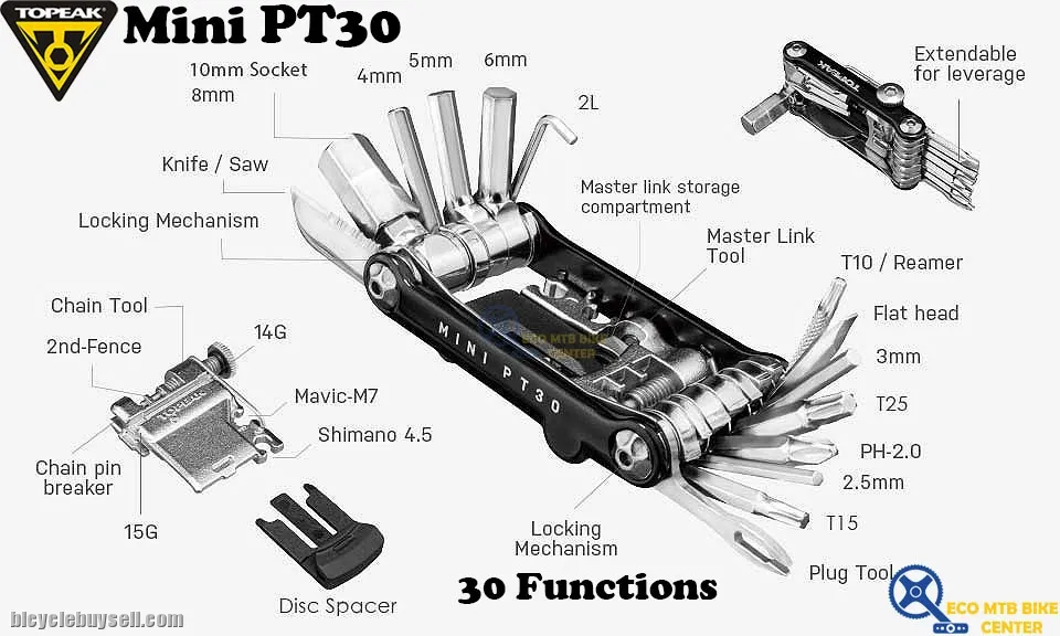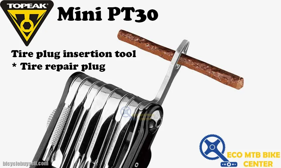 30 function, pro-quality, precision mini tool with integrated tubeless tire repair tools. Removable chain tool with built-in master link tool for removing and reinstalling master link type chains stores securely within the Mini PT30 body. Forged alloy body. Perfect for any road or trailside repair. * The chain tool is compatible with single and multi-speed chains up to 12 speed, NOT including Campagnolo® hollow pin chains.