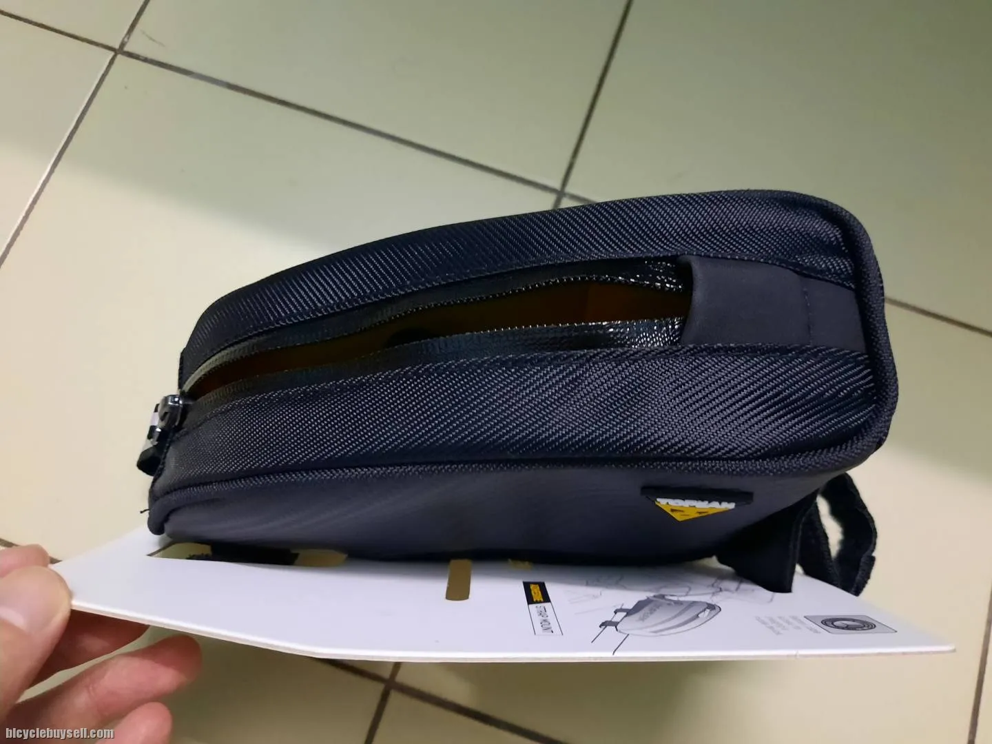 Large capacity top tube mounted bag giving cyclists quick and easy access to energy bars, phone, wallet, tools or any small essential gear they need close at hand. Features battery cable access for charging a mobile device.