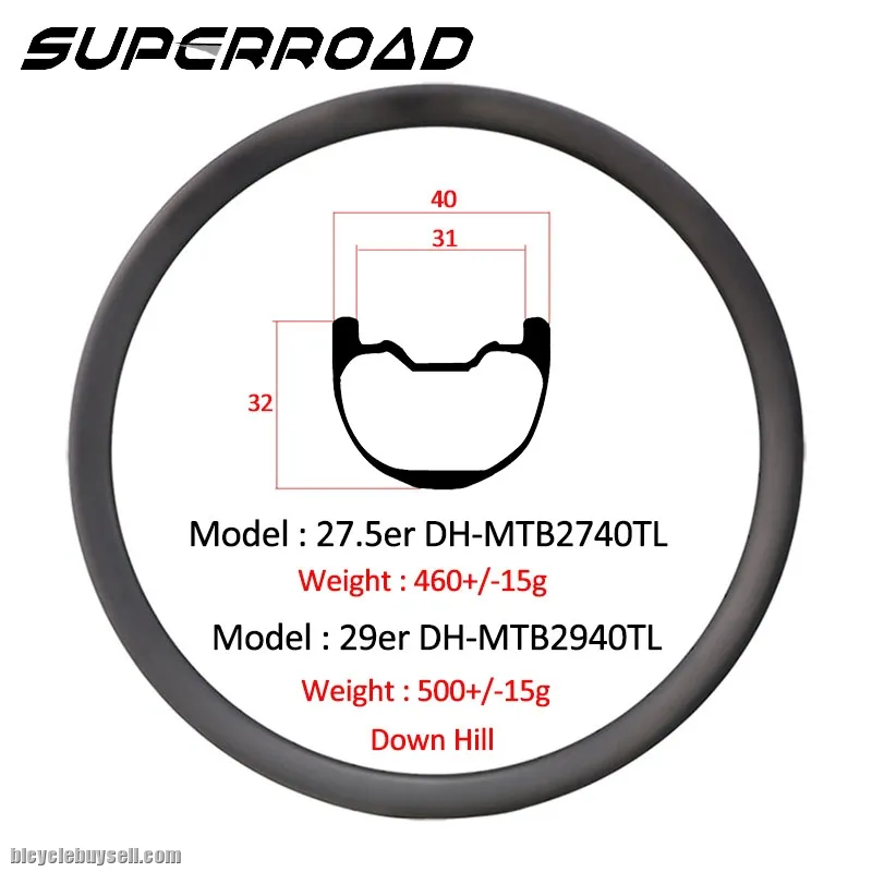 Model:DH-MTB2740TL Size:650B/27.5er RimWidth(outer/inner):40/31mm Rim Depth:32mm Weave:UD/3K/121K/will Finish:Matte/Glossy Use:DH Rim Type:Tubeless Ready Style:Hookless Brake System:Disc Brake ERD:537 Spoke Holes:28/32/36H Rim WeightT700:570+/-15g Angle:+/-5* Tyre Size:2.3-3.0" Max Spokes Tension:130kgf Max Tyre Pressure:60psi Max Rider Weight:110 Kg . Decals:Customized Warranty:2 Years Tel: +8613750980256 Whatsapp: +8613750980256 Website: http://www.superroadbikes.com
