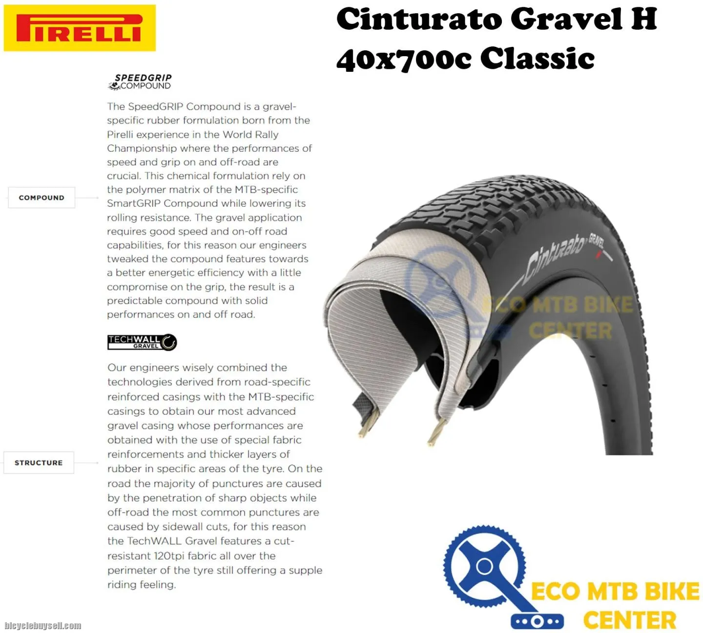 Cinturatoâ„¢ Gravel Hard Terrain is a gravel bike tire designed for compact and harder surfaces. The tread with low and narrow tread blocks and the high ground adaptation ensure a good contact area and thus also an optimal riding experience. The special SpeedGRIP compound reinforces the mechanical strength and chemical grip without reducing the smooth running. Cinturatoâ„¢ Gravel Hard Terrain is a high performance tyre with unique grip in all conditions, both dry and wet, and high puncture protection. Layers Tread The tread of Cinturatoâ„¢ Gravel Hard Terrain combines many small and closely spaced blocks and is made of a rubber compound that simultaneously guarantees good grip, high-level ground adaptation and wear resistance. The height of the tread blocks has been reduced to improve smooth running and, when cornering, to reduce their deformation on hard surfaces that do not allow "reaching through". This allows excellent handling and a confident driving experience on dry and wet surfaces. The whole tyre from one compound The properties of the new SpeedGRIP Compound are designed for all weather conditions, regardless of whether the surface is dry or wet. The new compound shares the same polymer base with the specific mountain bike compound SmartGRIP Compound, which improves smooth running. Structure Cinturatoâ„¢ Gravel Hard Terrain uses a reinforced internal structure, combining a sidewall-to-sidewall protective fabric layer with an Aramide tubeless-ready carcass optimized for wide, modern rims. As well as offering exceptionally high puncture protection, Cinturatoâ„¢ Gravel offers great smoothness and grip, resulting in a reliable and high-performance product: exactly what has made the Cinturatoâ„¢ brand by Pirelli famous. Scope of delivery: 1 tire Addition to weight: Manufacturer's specification Note: Tubeless Ready tires require tubeless compatible rims/wheels, tubeless valves, tubeless rim tape and sealing fluid for tubeless mounting. Sealant fluid is not required for tubeless UST tires, but is recommended for increased puncture protection. Installation should only be carried out by qualified personnel. TECHNICAL SPECIFICATIONS - Model: Cinturatoâ„¢ Gravel H Classic - Size: 700x40c - Weight: 505g - Casing: 120tpi - Anti-puncture: TechWALL - Compound: SpeedGRIP Please visit our website at http://www.ecomtb.com.my OR https://shopee.com.my/eco_mtb ** There is 1-3cm errors due to manual measurement. Please kindly understand. ** Actual product colour may slightly vary due to photographic lighting sources or your monitor settings. ** WE DO NOT DO COD ** ONLINE ONLY ** We support original products only. ** PRICE INDICATED IS ALREADY BEST PRICE, EXCLUDE COURIER