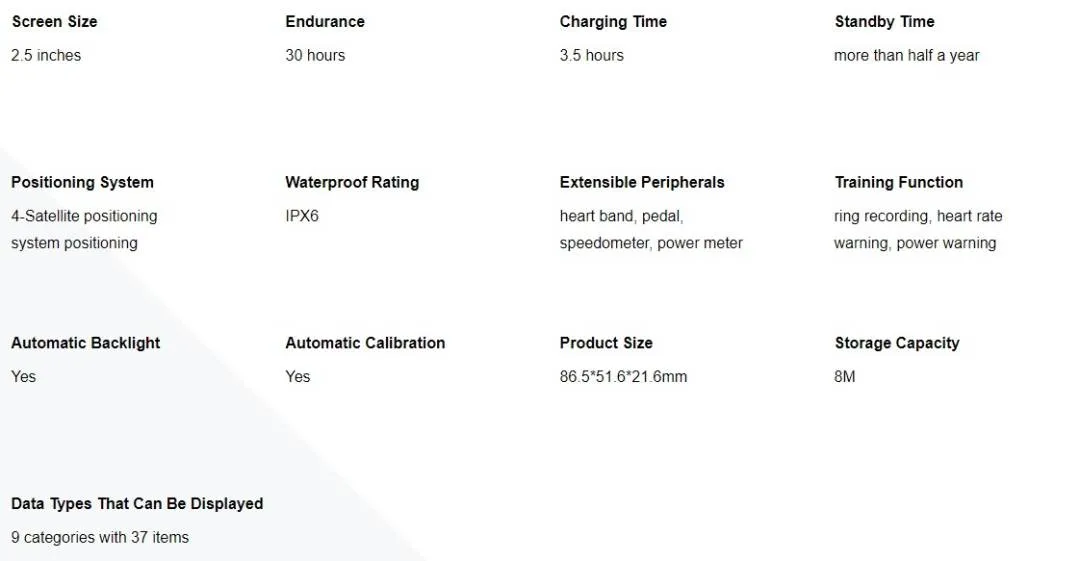 Nine data categories with 37 available data items and 26 adjustable bike computer settings. Comprehensive bike computer data and setting functions, estimated rider power (for non-power meter users), support for power-meter data and lap counting functions, even supporting left/right power balance data recording. Whether you are a beginner, advanced or professional training user, the C406 can meet all your needs.