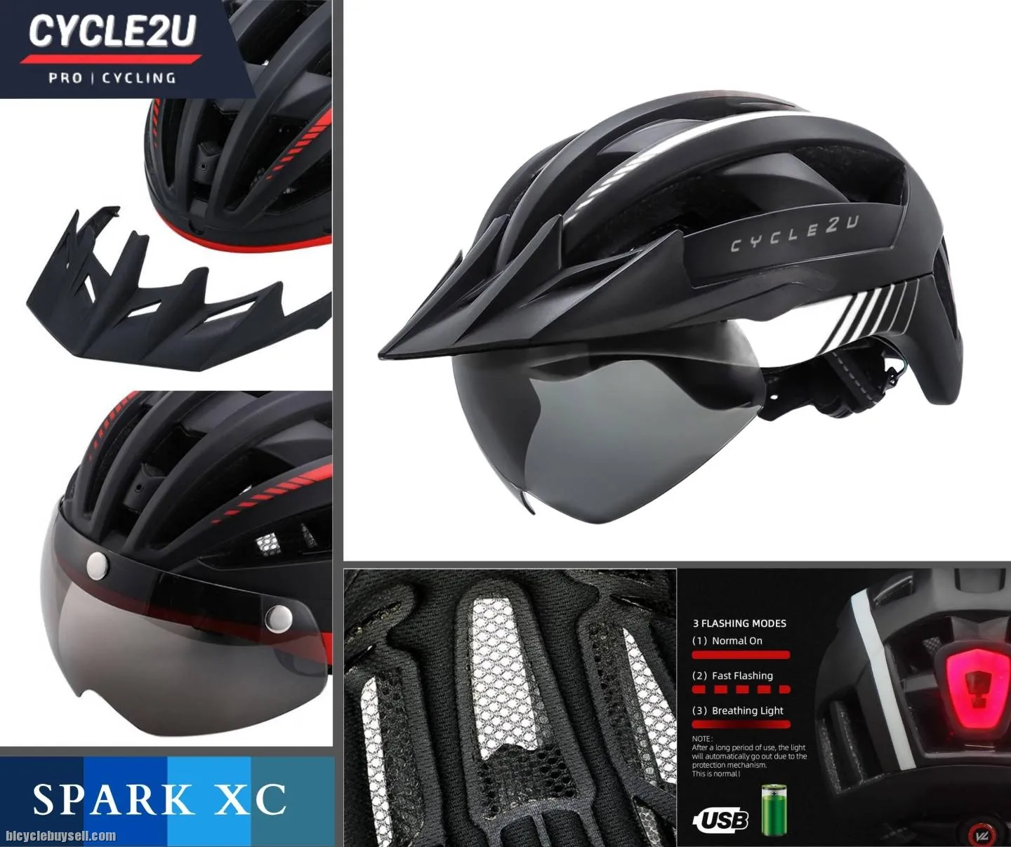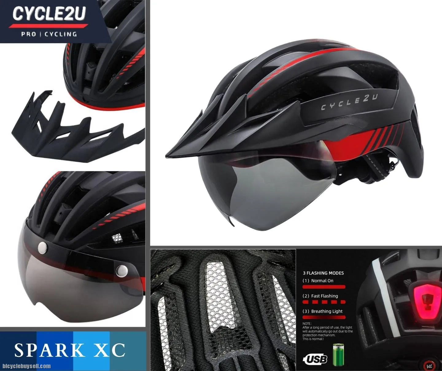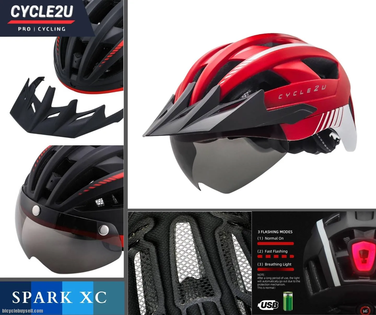 Genuine CYCLE2U SPARK XC Cycling Helmet Item Code: C2H04 Condition: 100% Brand New For purchase please click this LINK https://cycle2uworld.com/helmets/C2H04 shopee : https://shopee.com.my/%F0%9F%94%A5Ready-Stock%F0%9F%94%A5-CYCLE2U-SPARK-XC-LED-Backlight-Cycling-Helmet-Basikal-Helmet-Bike-Helmet-MTB-Roadbike-Helmet-Helmets-i.80489070.16813755841?sp_atk=c236f613-8984-4a9f-819d-52569b4709df&xptdk=c236f613-8984-4a9f-819d-52569b4709df Lazada : https://www.lazada.com.my/products/ready-stock-cycle2u-spark-xc-led-backlight-cycling-helmet-basikal-helmet-bike-helmet-mtb-roadbike-helmet-helmets-i2827968789-s13589699102.html?clickTrackInfo=query%253Acycle2u%252Bhelmet%253Bnid%253A2827968789%253Bsrc%253ALazadaMainSrp%253Brn%253Adc3839d04ea46ddc568611beb73498a8%253Bregion%253Amy%253Bsku%253A2827968789_MY%253Bprice%253A139.00%253Bclient%253Adesktop%253Bsupplier_id%253A1006%253Basc_category_id%253A10000903%253Bitem_id%253A2827968789%253Bsku_id%253A13589699102%253Bshop_id%253A17536&freeshipping=1&search=1&spm=a2o4k.searchlist.list.i6.217d5da98U9sBd Please Whatapps Me for the faster reply: http://www.wasap.my/60164584527 Wechat ID : QuickDial Website : http://www.cycle2uworld.com Show Room : 5-5-7 Hunza Complex, Jalan Gangsa, 11600 Penang. HIGH QUALITY GUARANTEE Specification: Scientific & Ergonomic design Ventilation: 20 Wind Tunnel vents with internal channeling, it could provide great using experience in air ventilation & heat dissipation One size: 57-61cm Integrated superbright 3 lighting warning modes USB rechargeable & IPX5 waterproof LED Rear Light Windproof & Strong Protection Magnetic Goggles, greatly protect your eyes and face filter the hard glare in the sun Equipped with a multidimensional regulation system, users can easily adjust the size not only up and down but also head perimeter for perfect sizing adjustment Certification: CE, EN 1078, CPSC Accessories Included: Integrated Backlight, Detachable Visor Feature: Material: High Density Polystyrene (EPS) as Inner support + PC, In-mold Construction Inner Pads: Washable comfort pads Adopted high density EPS structure, our helmet could strongly buffer the impact to protect your head Embedded keel skeleton core, it could provide excellent stability between helmets and head Detachable bugs net & sun visor, it could be your trustable guard to bugs and sunv Adjustable size regulator, the helmet could perfectly fits with your heads with easy adjustment The helmet stays steadily with head in the correct place with the help of the adjustable straps and multidimensional adjustment Large air vents design, it could provide great using experience in air ventilation & heat dissipation Streamlined integrated design,it could greatly reduce the wind resistance and improve the cycling performance Fashionable design, you could be the most eye-catching cyclist in the street Package includes: 1 x Genuine CYCLE2U SPARK XC Cycling Helmet 1 x Genuine CYCLE2U Helmet Bag