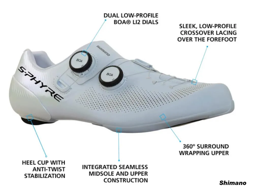 Shimano S-Phyre RC903 Road Shoe white Latest 2023 model -Lightweight and breathable microfiber leather upper provides optimal fit and superior comfort throughout your ride. - Premium-finish heel cup with anti-twist stabilization secures optimal foot positioning for intense acceleration. - Sleek, low-profile crossover lacing pattern elegantly secures forefoot. - 360º surround wrapping upper creates a supremely engineered fit for all riders. - Dual low-profile BOA® Li2 dials allow quick and precise micro-adjustments. - Integrated seamless midsole and upper construction set a new level of fit, stability and lightweight performance Following extensive, scientific testing and utilizing world class professional riders (Primož RogliÄ, Romain Bardet, and Lorena Wiebes will also showcase the RC903 shoes at the World Championships), these flagship shoes are the ultimate in elite racing apparel, offering improved comfort, lower weight, and sleeker lines than their predecessor. color white Size Available : 44 for enquiry and puchase , pls kindly contact below no:- meks : 0123131704 http://www.wasap.my/+60123131704/rc903 Tq