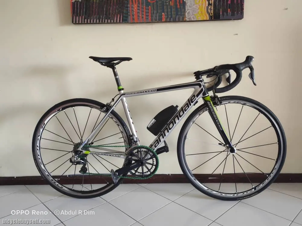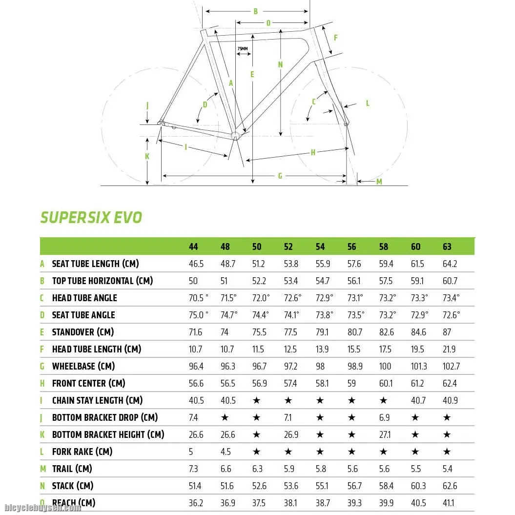 FRAME Cannondale SuperSix EVO, BallisTec Hi-Mod Carbon, Di2 compatible, Speed Save, PressFit30a FORK Cannondale SuperSix EVO, Speed Save, BallisTec Hi-MOD full Carbon, 1-1/8" to 1-1/4" steerer, integrated crown race HEADSET 1-1/8" to 1-1/4" FRONT-MECH COMPATIBILITY braze-on type BOTTOM BRACKET PF30a SEATPOST CLAMP 27.2mm diameter SEATPOST BINDER 25.4mm diameter BRAKE MOUNTS standard road calliper mount MAX TYRE SIZE 700 X 28c HUB SPACING standard 130mm road rear and 100mm front QR WEIGHT 1057 grams complete frameset includes BallisTec Hi-Mod fork SIZE 48 (Refer to Size Chart Attached)