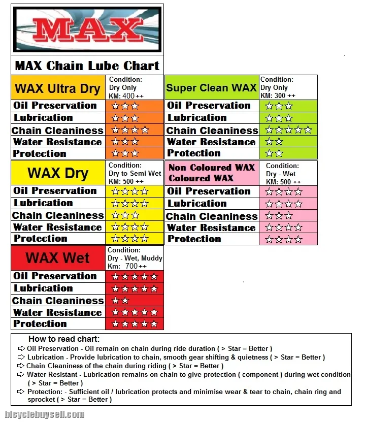 Please refer to our MAX Chain lube chart to select the correct lube which suit your requirements of oil retaining, lubrication to component, cleanliness, water resistant and how much protection it gives to your bike's component