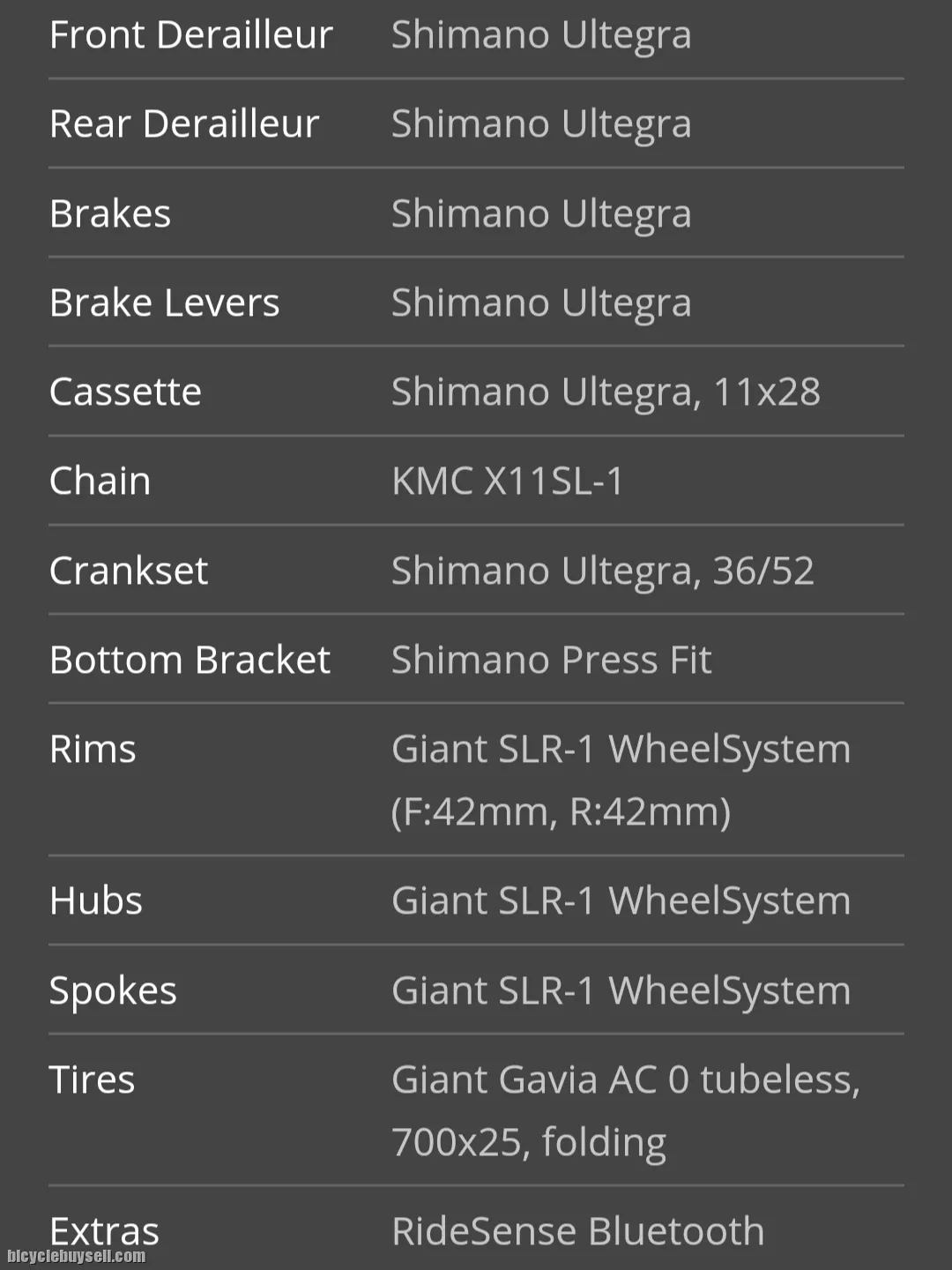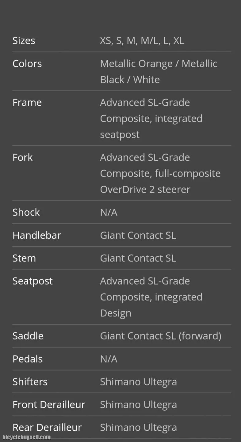 Sizes : S Colours : Metallic Orange / Metallic Black / White Frame Advanced SL-Grade Composite, integrated seat post Fork : Advanced SL-Grade Composite, full-composite OverDrive 2 steerer Handlebar : Giant Contact SL Stem : Giant Contact SL Seatpost : Advanced SL-Grade Composite, Integrated Design Saddle : Giant Contact SL (forward) Shifters : Shimano Ultegra Front Derailleur : Shimano Ultegra Rear Derailleur : Shimano Ultegra Brakes : Shimano Ultegra Brakes Levers : Shimano Ultegra Cassette : Shimano Ultegra, 11x28 Chain : KMC X11SL-1 Crankset : Shimano Ultegra, 36/52 Bottom Bracket : Shimano Press Fit Rims : Giant SLR-1 WheelSystem (F:42mm, R:42mm) Hubs : Giant SLR-1 WheelSystem Spokes : Giant SLR-1 WheelSystem Tires : Giant Gavia AC 0 tubeless, 700x25, folding Extras : RideSense Bluetooth Weight : 6.8 Kg 013 9217119