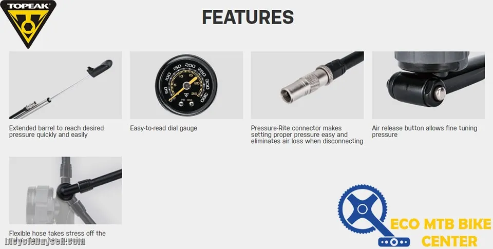 A precision fork and shock pump with an easy-to-read dial gauge for accurate pressure readings up to 360 psi / 24.8 bar. An air release button and Pressure-Rite connector makes setting proper pressure easy and eliminates air loss when disconnecting, while the flexible hose takes stress off the valve stem when pumping.