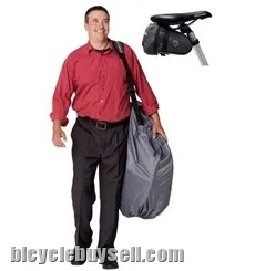 The CarryOn Cover (main image above) is aimed at commuters who want to take their folding bikes on trains, buses and subways. A patented strap system supports the weight of the bike, so the outer cover can be made of light and highly compressible material. This means the bag rolls up to the size of a sandwich and can be stuffed into its own saddle wedge.