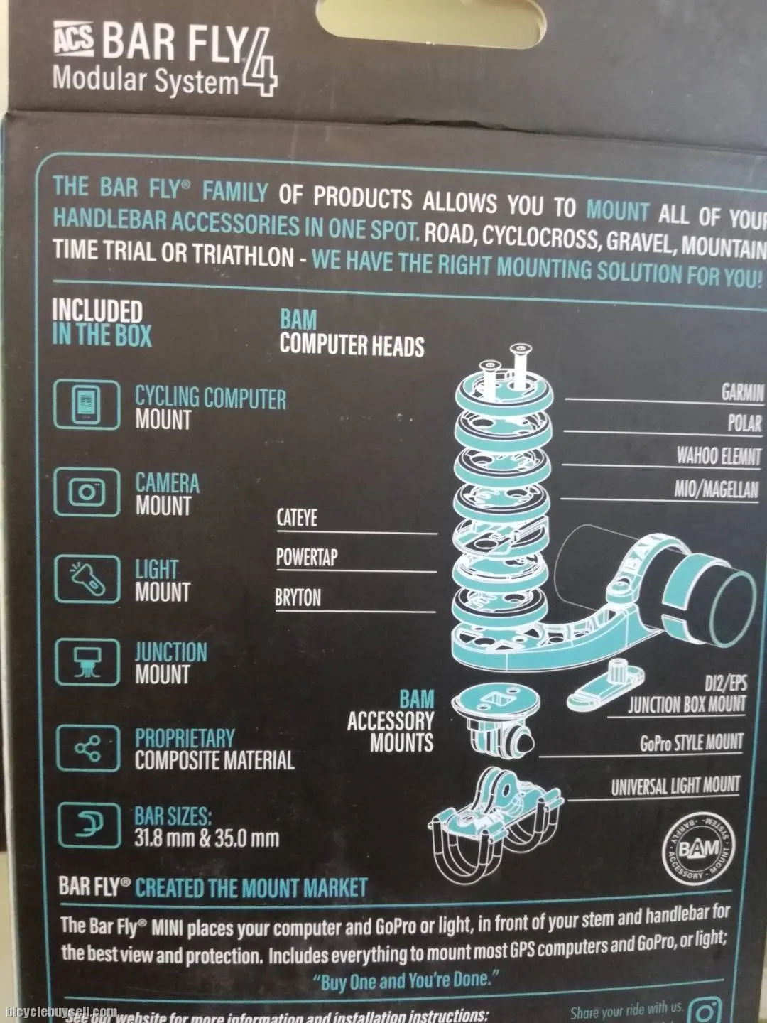 The Bar Fly 4 Mini is an “out-front†mount made specifically for smaller cycling computers. Modular system mounts your computer, Di2/EPS juncion box, and a GoPro or light. Compatible with 31.8mm and 35.0mm handlebars. #BF4MNB-199