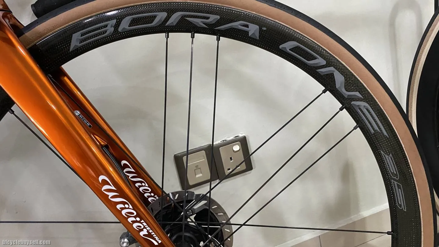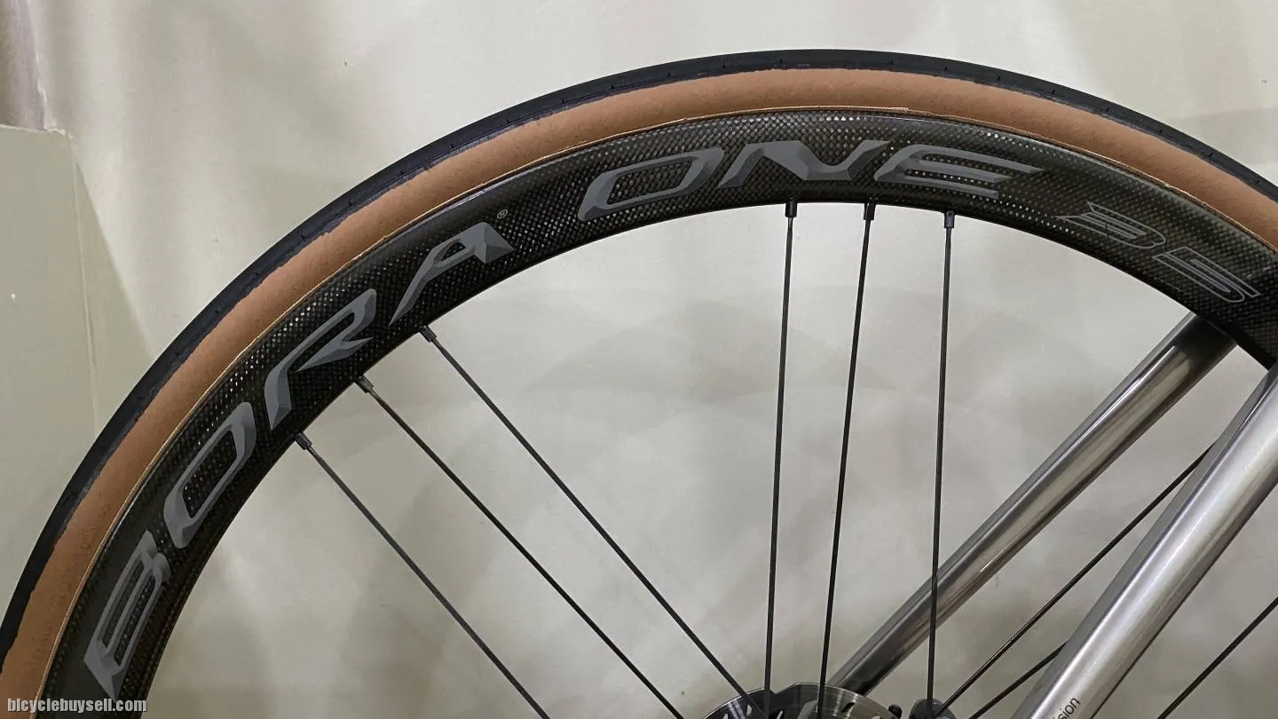 Selling my Bora One 35mm disc brake version With bag - Sold in as is condition Material: Carbon (rim), Aluminium (hub, nipples), Stainless Steel (Spokes) Rim Profile: 35mm (height), 24.2mm (width) Spokes: Bladed aerodynamic spokes Rim type: Clincher Thru Axle 100mm (front), 142mm (rear) Aluminium hub USB bearings