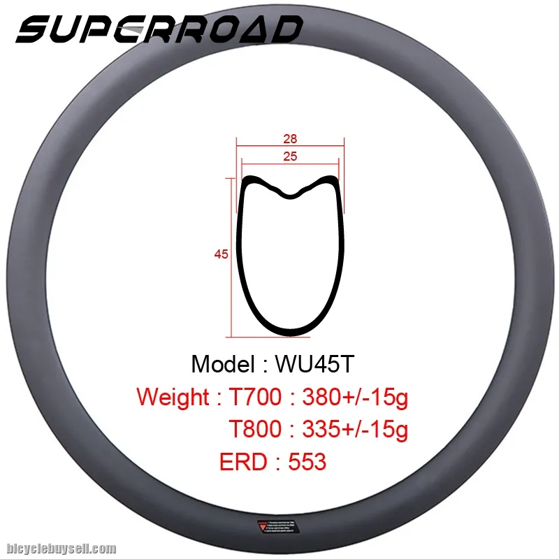 Model:wU45T Size:700c Material:Full carbon T700 Brand Name:Superroad Brade Track Width: 25mm Drilling:Traditional/Internal Max Width:26mm spoke Hole:16/18/20/21/24/28H Rim Depth:45mm Brake Track:Carbon,Basalt,Disc Brake Rim Type:Tubular weave: UD/3K/12K,3K Twill,12K Twill,3K+Kevlar weight:395+/-15g Finish: Matte/Glossy ERD:549mm Max Tyre Pressure: 125Psi/8.5Bars Max Spokes Tension:130kgf Roundness:<0.25mm Brake Track Flatness:<0.15mm Max Rider Weight: 125kg Decal: customized standard:EN Business:OEM&ODM warranty: 2 Years Tel: +8613750980256 Whatsapp: +8613750980256 Website: http://www.superroadbikes.com