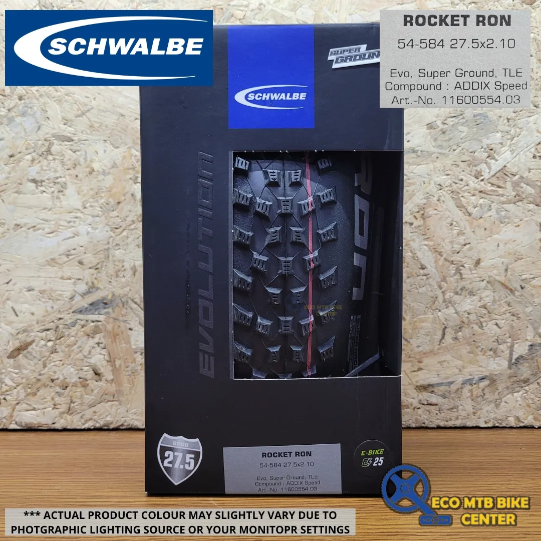 LIFT OFF! The cross-country rocket combines speed and cornering control at the highest possible level. An excellent all-rounder for racetracks. • Cleverly designed tread balanced for low rolling resistance whilst remaining grippy. • Sufficient gaps for amazing self-cleaning properties. • Stable shoulder studs. More information : https://www.schwalbe.com/addix-compound/ Size : ETRTO 54-584 (27.5 x 2.10Inch) Type : Folding Compound : ADDIX Speed Execution : Super Ground Color : Black Seal : TLE Weight : 560 g Pressure : 2.00 - 4.00 Bar (30 - 55psi) Maximum load : 100 kg EPI : 67 E-bike : E-25 Profil : HS438 Article number : 11600554.03 EAN : 4026495876995 Tube : 19, 21, 19A, 21A, 21AP, 21+AP, 21F Please visit our website at http://www.ecomtb.com.my OR https://shopee.com.my/eco_mtb ** There is 1-3cm errors due to manual measurement. Please kindly understand. ** Actual product colour may slightly vary due to photographic lighting sources or your monitor settings. ** WE DO NOT DO COD ** ONLINE ONLY ** We support original products only. ** PRICE INDICATED IS ALREADY BEST PRICE, EXCLUDE COURIER