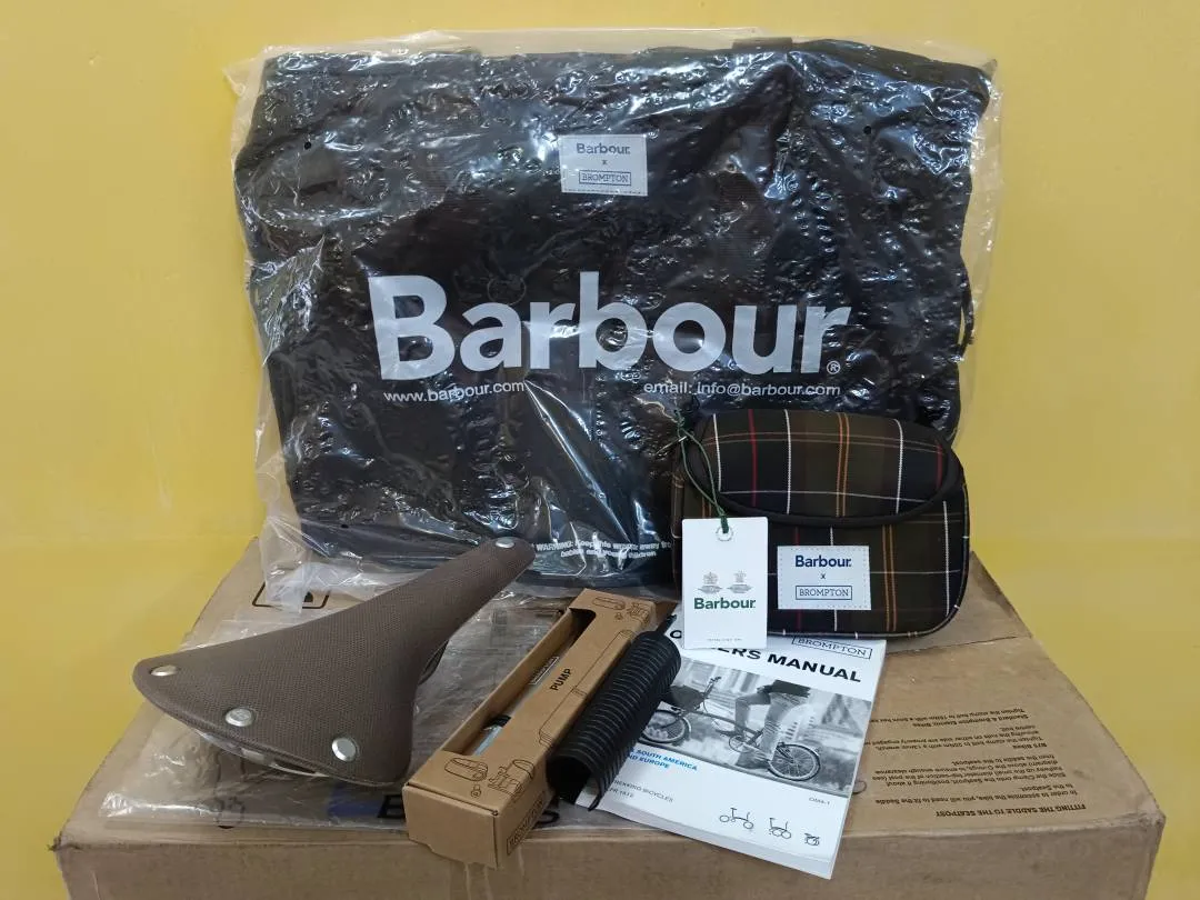 Carton box + Booklet + Lezyne Pump Chrome. Barbour Wax Holdall Bag & Barbour Zip Pouch Brooks C17 Barbour Saddle