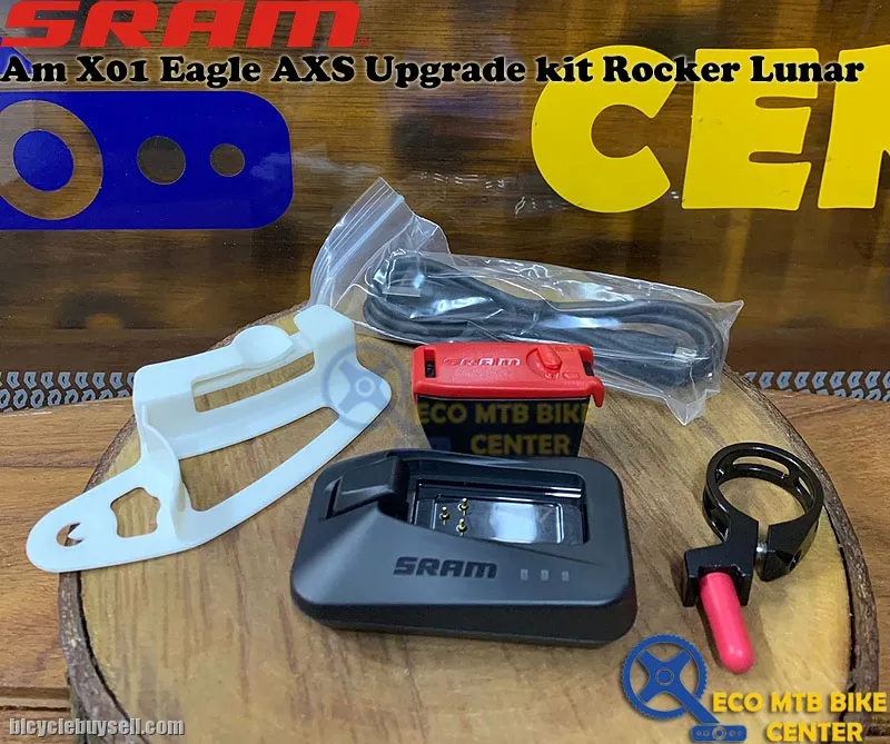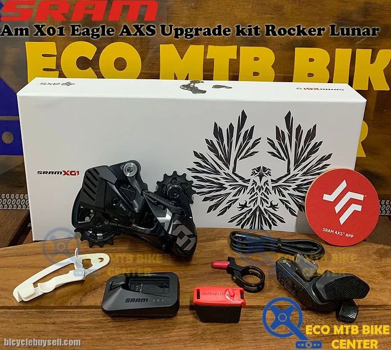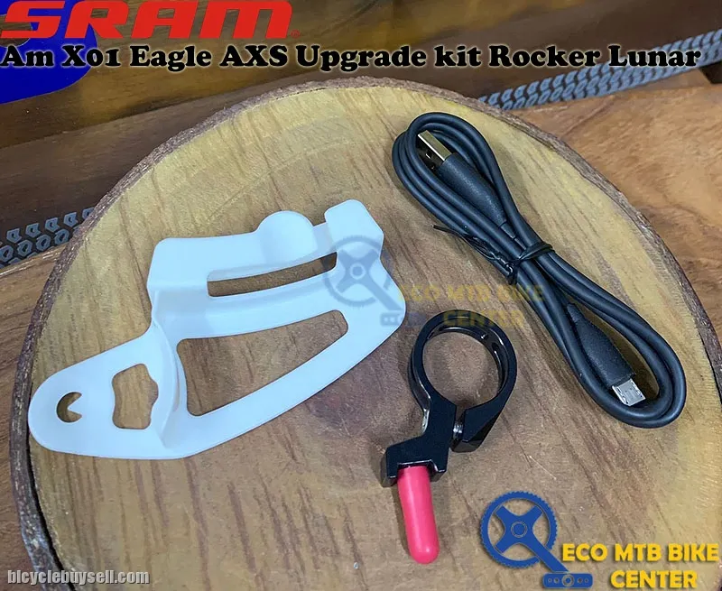 Kit includes the SRAM X01 Eagle AXS rear derailleur with battery, Eagle Rocker controller with discrete clamp, and charger and cord