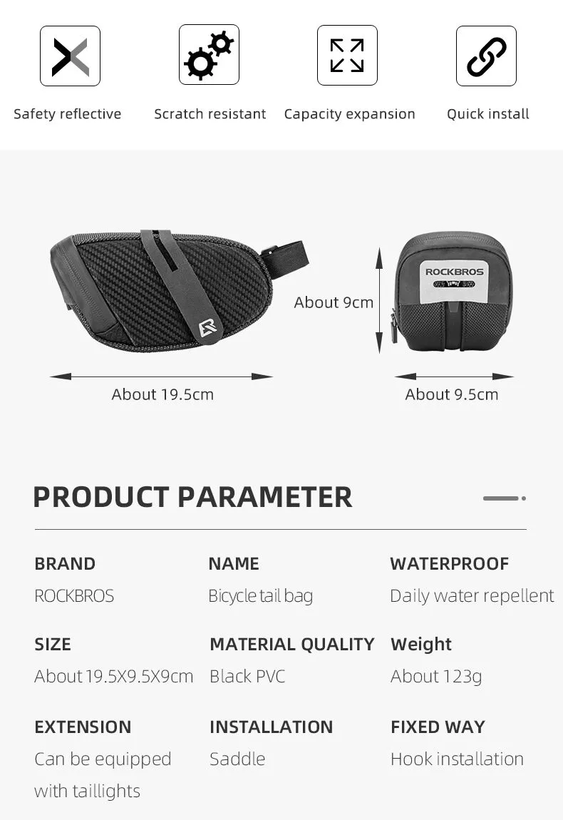 ROCKBROS Saddle Bag C28 Size : About 15.5*6.5*5 CM Weight : About 56G,44G Material : Nylon Style : Saddle Bag Capacity : About 1 L Tip: The hook style is hook installed ROCKBROS Saddle Bag B74 Name:Bicycle Tail Bag Size:About 19.5*9*9.5cm Materail: Black PVC Weight: About 123g Fixed way: Hook installation Waterproof:Daily water repellent - Easy To Install - Scratch resistant - Externally Mountable Taillights - Front and Side reflective warning strips - Portable - Resin Zipper, Feel Comfortable / Smooth and not stuck  Packages : ROCKBROS Bicycle Saddle Bag 1 pcs Order Here > https://www.icebikeheaven.com/rockbros-bicycle-saddle-tail-bag-mini-tool-bag-c28-large-space-bag-b74 Deliver to Malaysia, SG, Brunei, Worldwide Accept Ewallet Boost TouchnGo Etc.. & Credit card How to Order 1.Product Option: 2.Quantity: 3.Color: 4.Name: 5.Address: 6.Contact number: Send to ☎FB http://m.me/icebikeheaven ☎ http://www.wasap.my/60174204398 Sales, Order, Customer service ☎ http://www.wasap.my/60195272398 After sales/ Warranty FOLLOW US ✔ https://www.ebay.com/str/icebikeheaven37 ✔ https://shopee.com.my/icebikeheaven?tab=shop ✔ http://www.lazada.com.my/ice-bike-heaven/ ✔ https://fb.me/icebikeheaven ✔ https://www.instagram.com/icebikeheaven37/ Buy from Us! 🚴🏻💯% POSITIVE FEEDBACK 🚴🏻💯% Warranty & After Sale Service 🚴🏻💯% PARCEL ARRIVAL GUARANTEED 🚴🏻💯% ❌hidden charges 🚴🏻 7️⃣ days size exchange 🆗 🚴🏻 7️⃣ days 100% 💲💲 Guarantee back ☄ Prompt response 🥇♞ SSM Registered company- Icebikeheaven 🥇 8 Years of experience Wish to be dropship? contact us now.