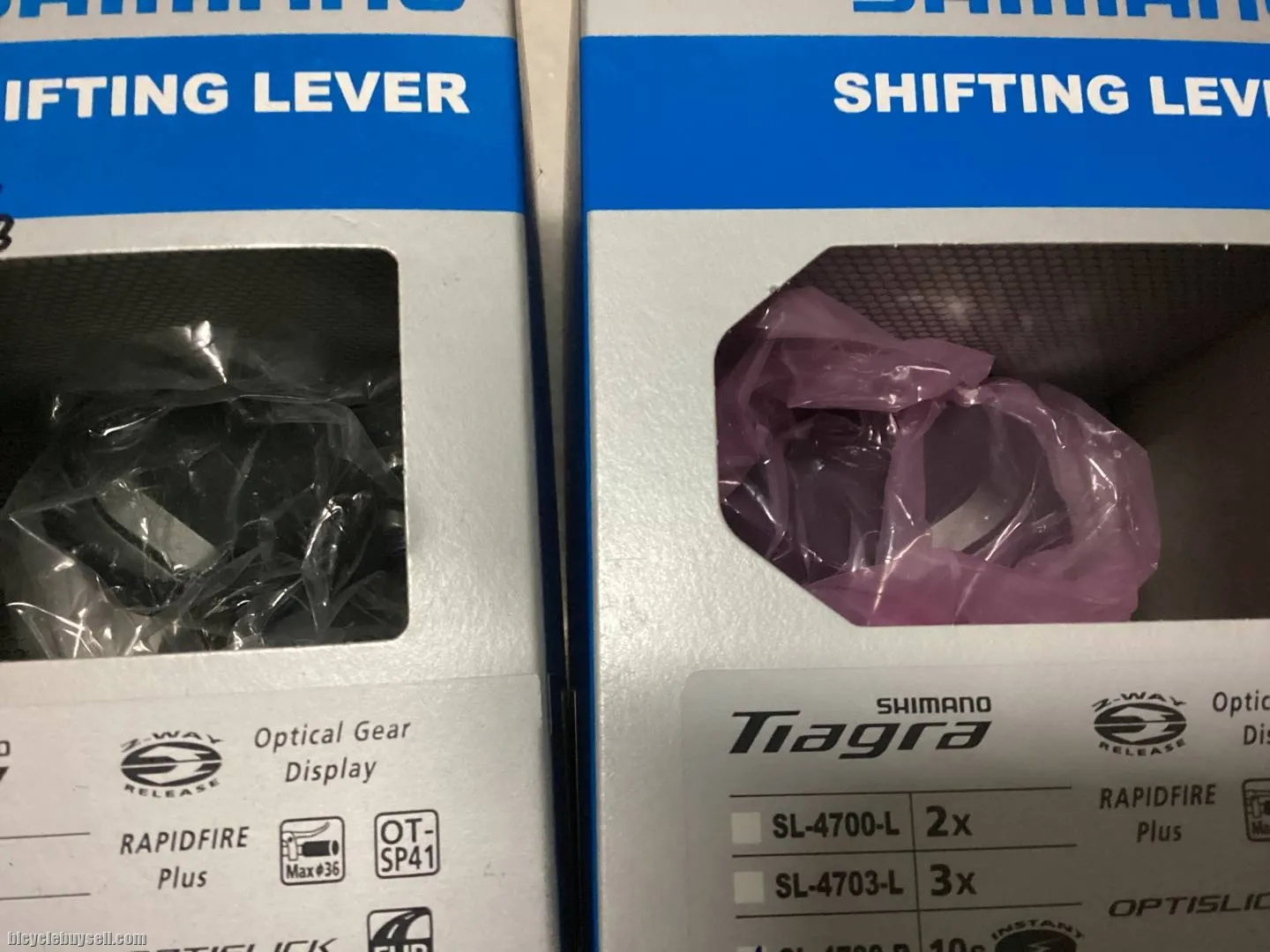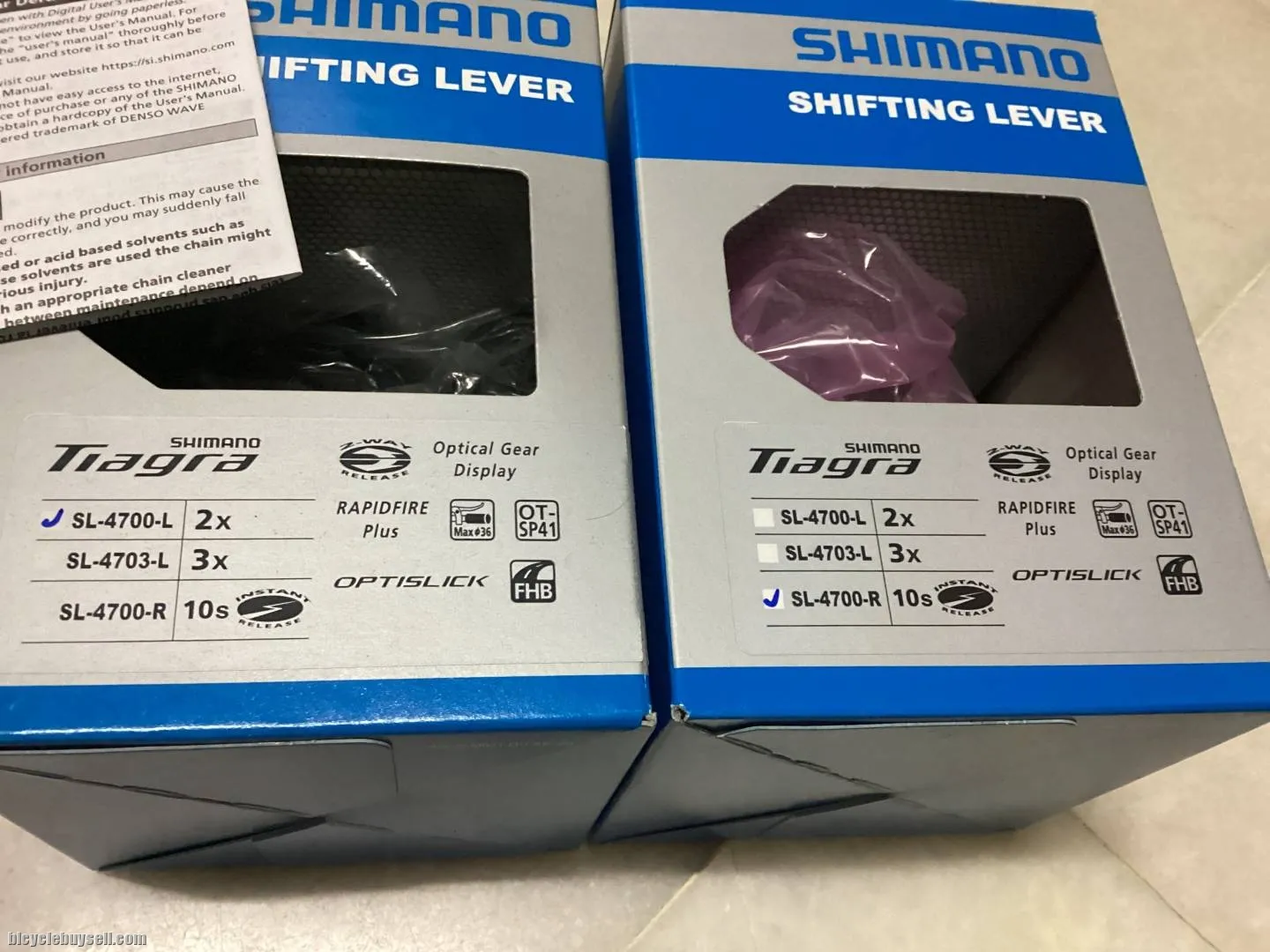 SELLING SET ONLY… Shimano Tiagra 2x10speed shifter for folding bike x flat bar. SHIMANO TIAGRA Shift Lever Flat Bar Road 2x10-speed SL-4700 SHIMANO TIAGRA - RAPIDFIRE PLUS - Shift Lever - Flat Bar Road - 2x10-speed With a comfortable, ergonomic lever shape, SHIMANO TIAGRA's SL-4700 shift lever provides intuitive and responsive shifting for flat bar road bikes. The RAPIDFIRE PLUS shift lever features a smooth multi-shift action and crisp index feedback. The lever also includes SHIMANO's OPTICAL GEAR DISPLAY, which shows riders what gear position is selected while riding. https://bike.shimano.com/en-EU/product/component/tiagra-4700/SL-4700.html Free pos west.m. Sabah Sarawak add Rm15. Tel:012-419 8933