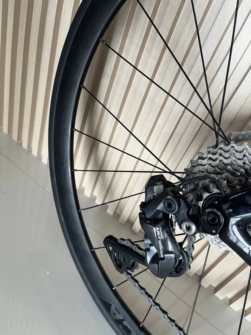 Excellent condition: Recent fresh chain, cassette and tyres. New alloy wheels and brake pads. Bike looks like new, no scuffs on shifters or seat and frame paint is in excellent condition.