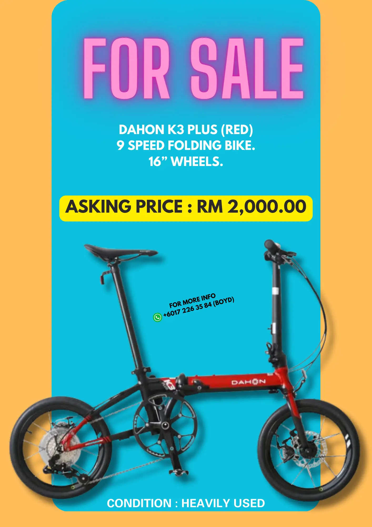 DAHON K3 PLUS. 9 SPEED. 16” WHEELS. FOR SALE.