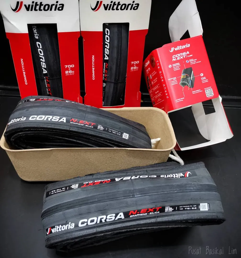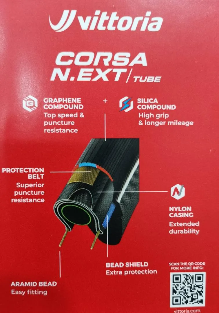 Corsa N.EXT is the exciting new addition to the Corsa family. Designed to satisfy the requirements of enthusiast cyclists who clock up the miles on long and demanding weekly rides, Corsa N.EXT combines Vittoria's peerless knowledge of racing performance with the durability of a long-lasting nylon casing that uses a unique Silica and Graphene compound for improved rolling efficiency, grip and longer wear-life. To increase puncture protection, the central section of the casing features 3 layers of nylon as well as an additional puncture protection belt. Corsa N.EXT is the first road racing tire to feature a QR Code - printed on the tire hot patch - for easy access to useful technical information about the tire.