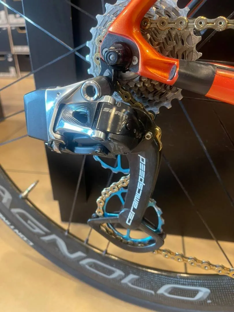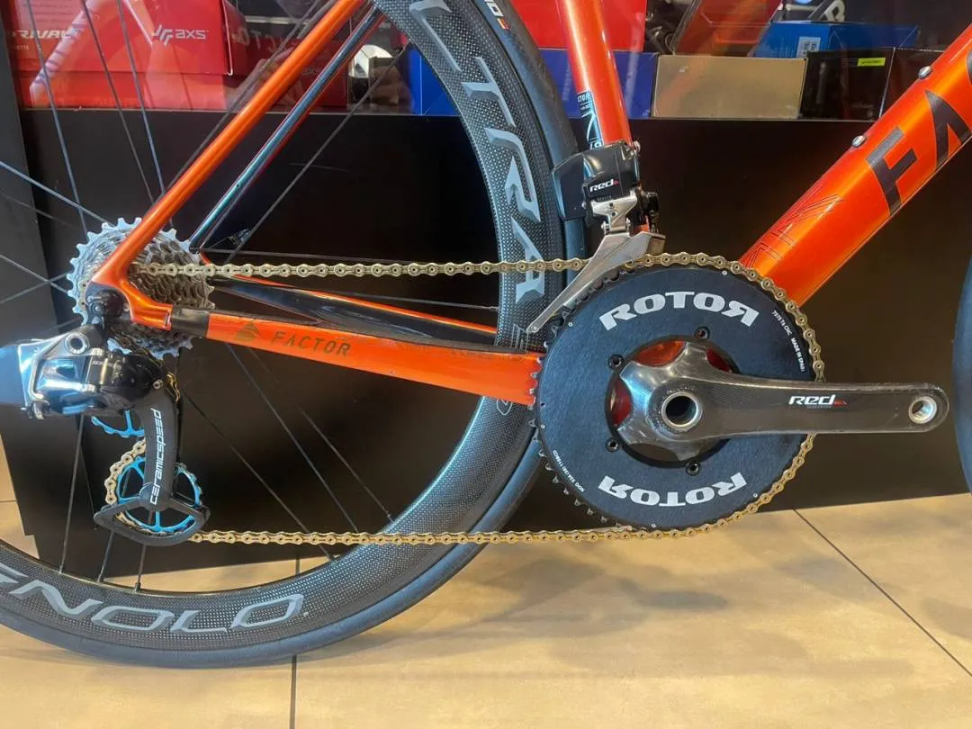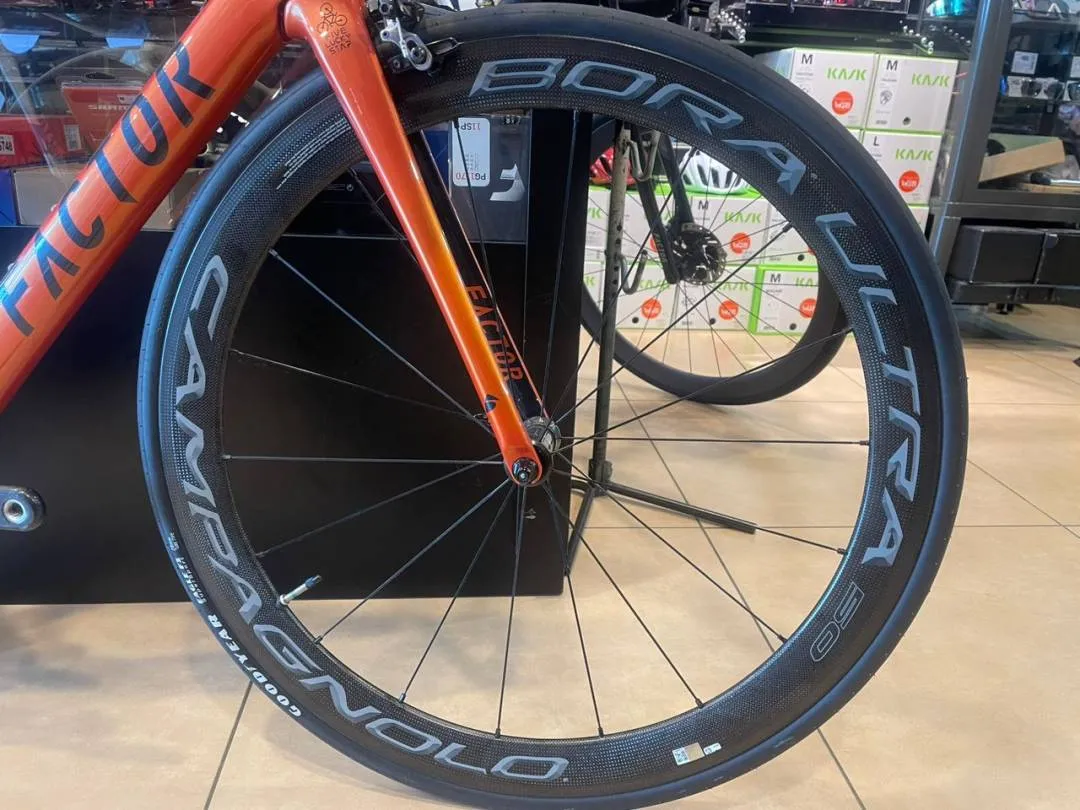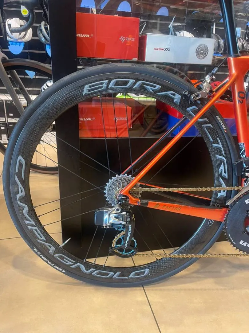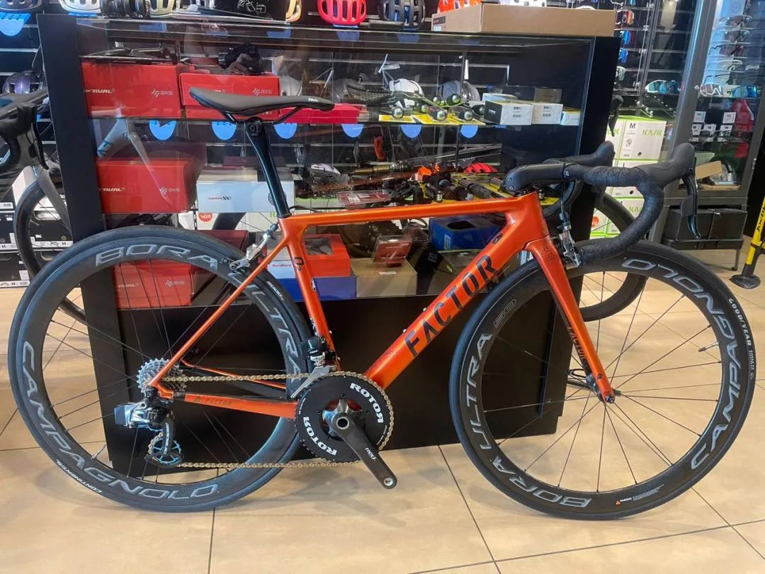 Factor O2 size 49 Sram etap with 11speed 3t carbon handlebar Enve stem with enve meter mount Fabric saddle Ceramic speed over size pully Ceramic b.b Campagnolo bora ultra 50 Rotor chairing 53-39 Blackinn seatpost Pls only WhatsApp 012-5555264