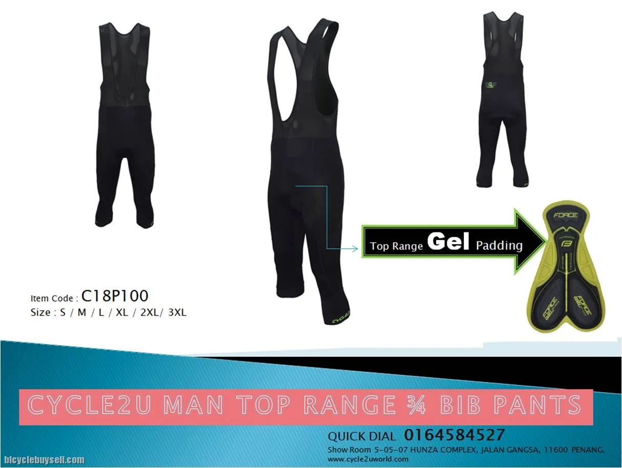 Original CYCLE2U ADVANCED TOP RANGE GEL MAN 3/4 BIB PANTS Item Code : C18P100 To purchase please visit www.cycle2uworld.com Thanks for interesting our product Please Whatapps Me for the faster reply: www.wasap.my/60164584527 Wechat: QuickDial Show Room : 5-5-7 Hunza Complex, Jalan Gangsa, 11600 Penang. Website : www.cycle2uworld.com Material: 80% Nylon, 20% Spandex Padding: Premier quality Italy GEL Pad Fabric: Taiwan Lycra+grid breathable fabric Breathable mesh straps to prevent overheating Contoured seams to aid fit and eliminate excess fabric Weight: 180g / pc Size : S, M, L, XL,2XL, 3XL Reflective CYCLE2U logo for added safety during night riding Anti-Bacterial, Anti-UV, Breathable, Plus Size, Quick Dry, Lightweight Effectively reduce wind resistance Please LIKE our Facebook Page Quick Dial Enterprise