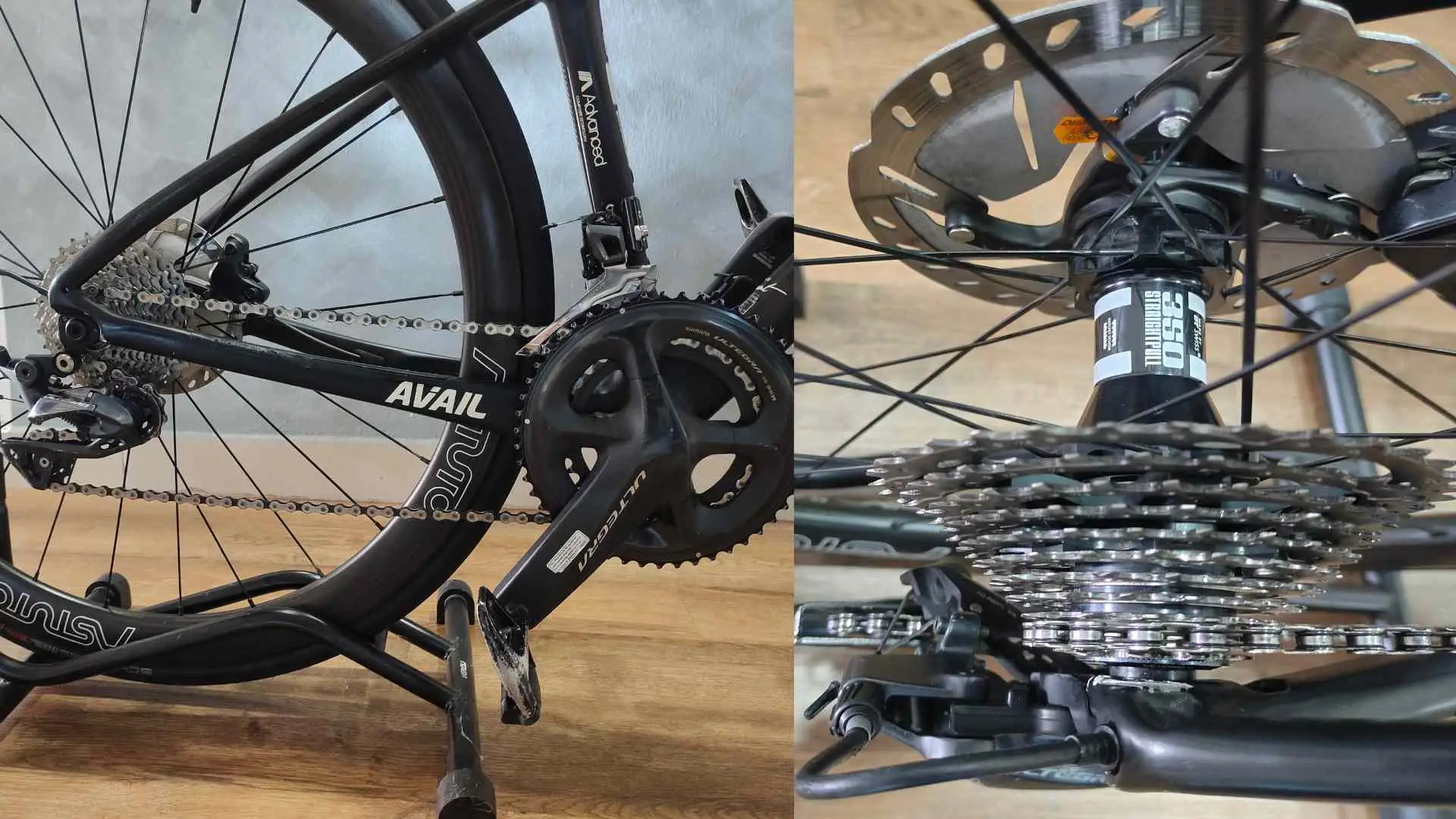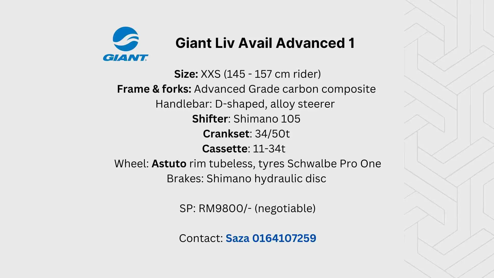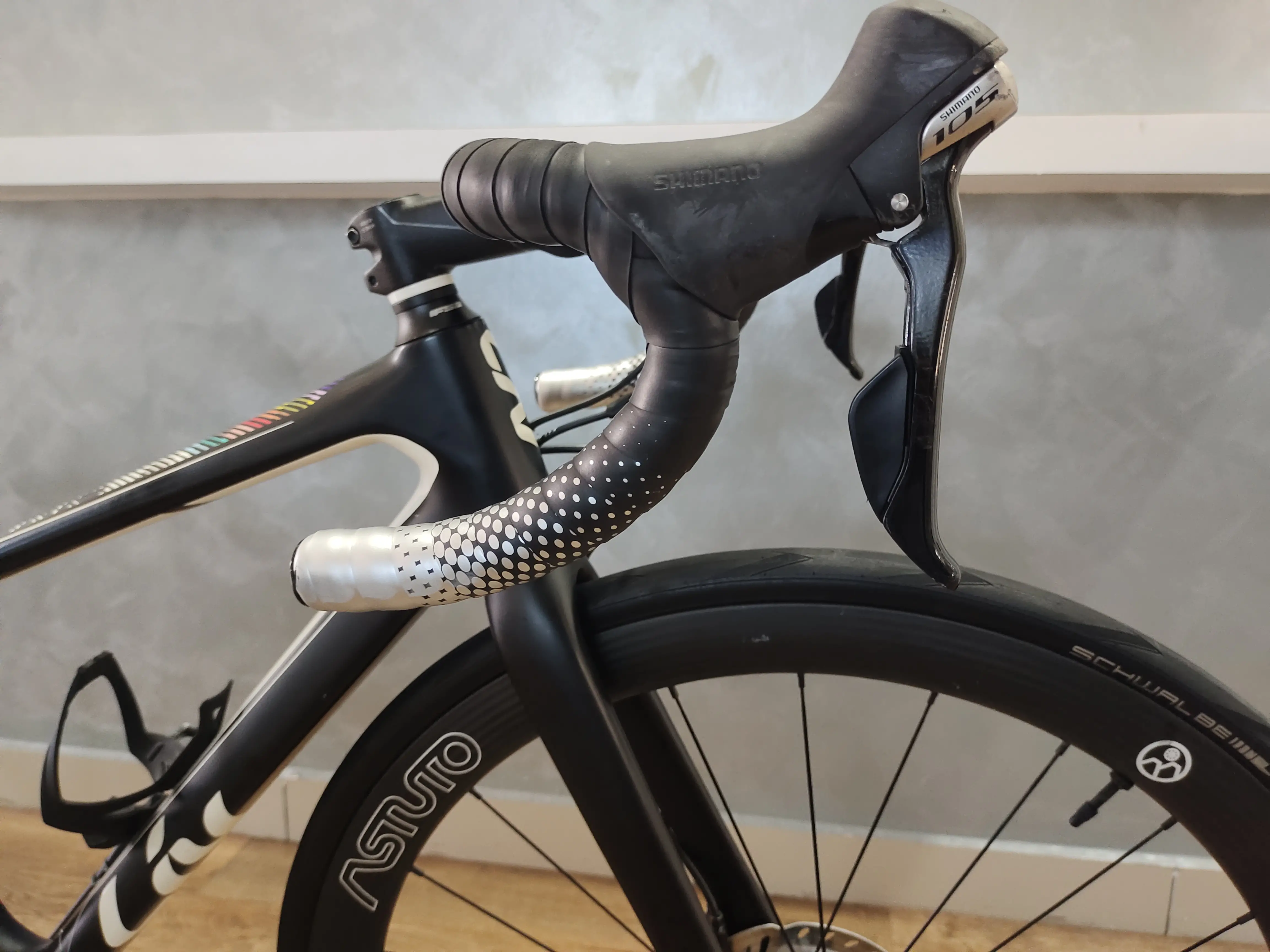 XXS (145-157cm rider). Carbon composite, Shimano 105 shifter, hydraulic brake, Ultegra rear derailleur, Astuto rim, Schwalbe Pro One tyres.