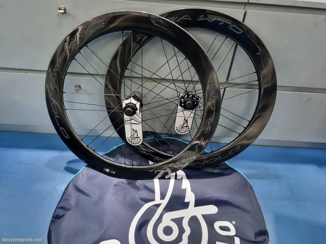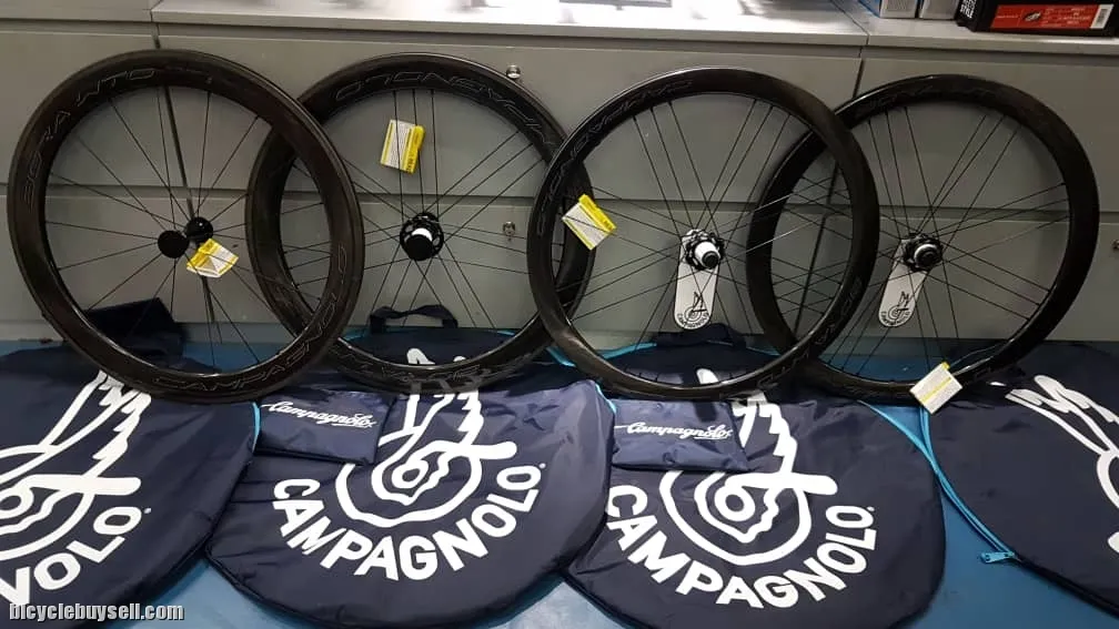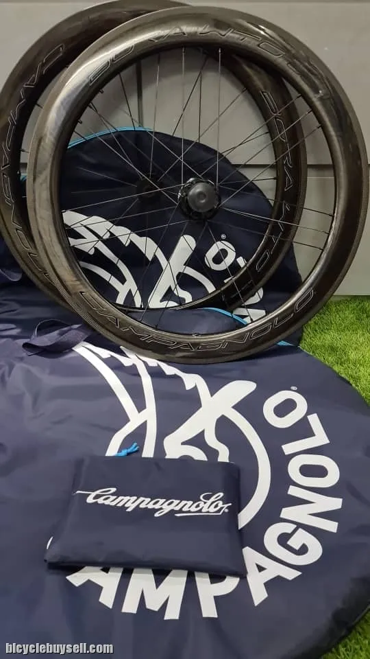 As salam WTS Brand new Carbon Wheel Disc Version Wind tunnel optimized technology 700cc Clincer wheelset 2 way fit Shimano Body Hub Compatible Rim depth 60 mm Weight 1.4kg 💯% Original Compagnolo made in Italy Comes with manual book, warranty card (SPOKES) Number of spokes: 18 front and 21 (G3) rear RDB – Rim Dynamic Balance Bladed aerodynamic spokes Stainless steel spokes Ultralinear™/DRSC™ geometry Aluminum nipples (Rim) Profile height: 60 mm Rim section (height/width): 60mm/24,2mm Rim material: Carbon Graphic colours: Bright Label and Dark Label (HUB) Aluminium hub with black finish USB bearings Hub edge: 100mm (front), 130mm (rear) Oversize flange Cup-and-cone bearing system Postage can be arranged within Peninsular Malaysia and Sabah Sarawak For more product search under my listing, please use URL link below to search the product you need. Thanks a lot for your time and interest:- https://bicyclebuysell.com/?user=safiuddin#!username=safiuddin Feel free to call or WhatsApp me Din : 013-5315121 http://www.wasap.my/60135315121