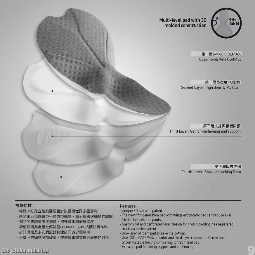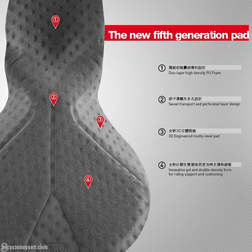 Men Pro 3/4 Bib Tight 5th Gen Pad More than 30 years of research development and tested by professional athletes, the ATLAS 5th gen pad is suitable for different types of occasion, position and long distance on the saddle. Patented 3D Ergonomic crotch pad designed based on body geometry provides an ultra-comfortable feeling. The components are instead from the bottom, allowing smooth and flat surface direct contact to the skin. Built with 30 Engineered multi-level pad (lateral flaps, shaped 90 degrees). 4 layers padding has more volume in the foam, but with the advantage of feeling less bulky. A – Outer level 94% CoolMax B – Second Layer High-density PU foam C – Gel for cushioning and support D – Fourth Layer Shock-absorbing foam Composition Surface: Nylon 76% +Lycard sport 24% Thermal printing:Nylon 80% +Lycard sport 20% WHATSAPP / CALL LIANG 0137773842